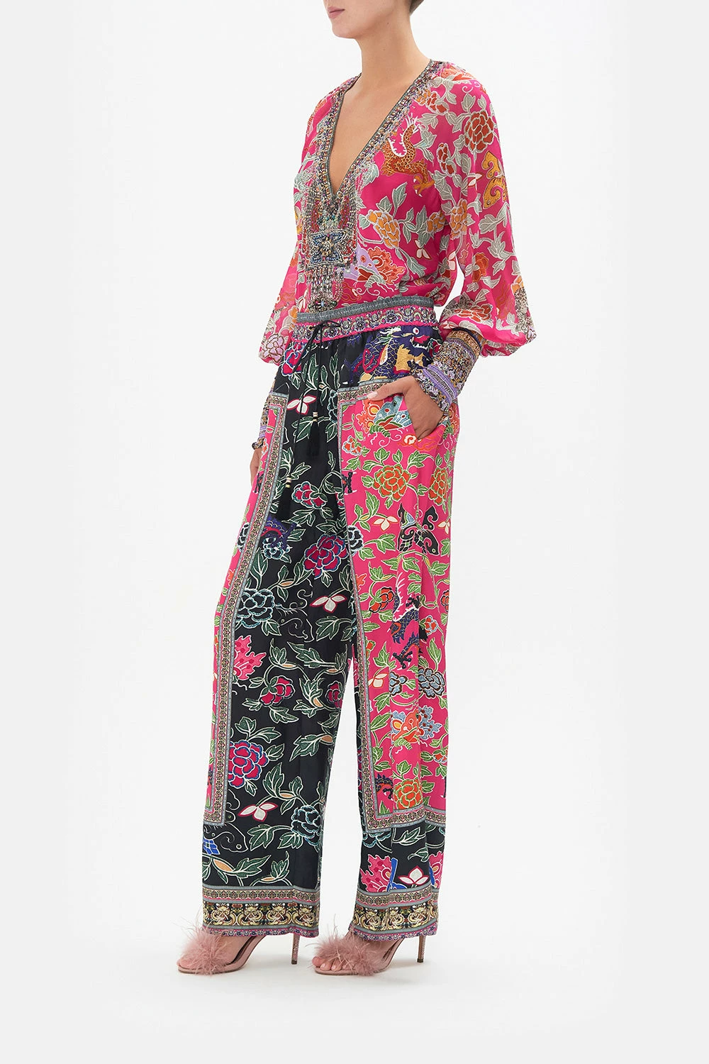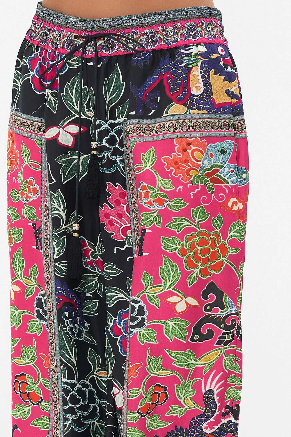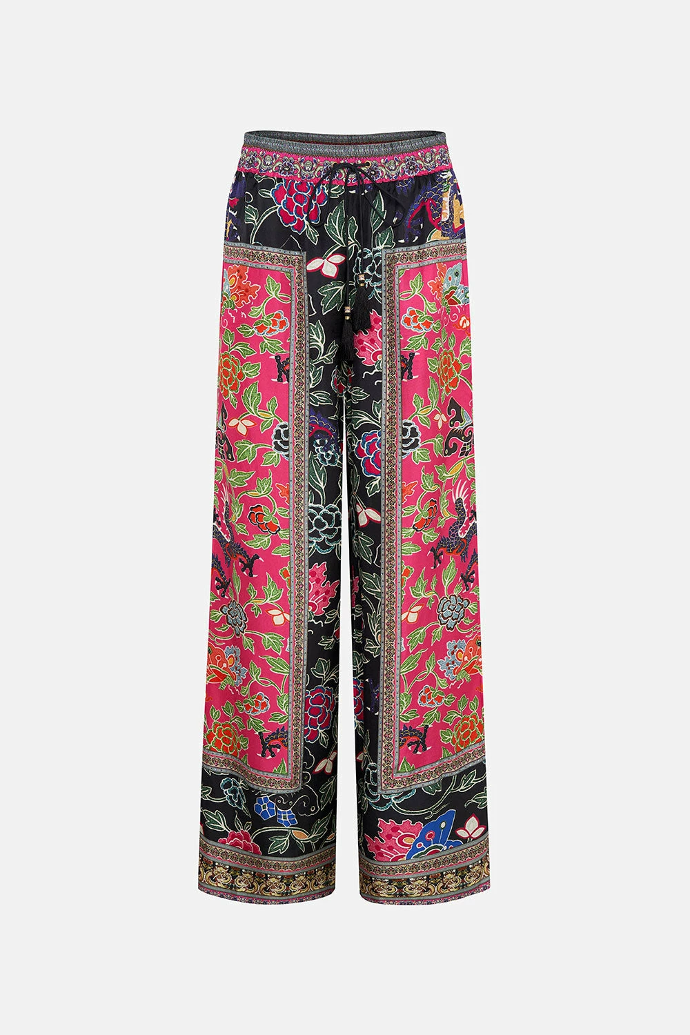 Wrapped in ancient wonder and Eastern odes, the Twilights Token Straight Leg Pant is enveloped in a mosaic of leafy vines, raspberry botanicals and curious dragon eyes upon a sea of midnight and ruby hues. Complete with hand-embellished CAMILLA crystals, these luxury silk pants feature a tassel-tie drawstring waist, a relaxed silhouette that falls into a wide straight leg and pocket functionality.