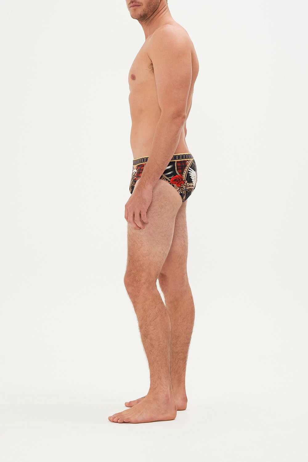 Exclusive to our CAMILLA x Robbie Williams collection, the Do I Entertain You Swim Brief is wrapped in midnight hues encased in splashes of crimson tartan, delicate big cat portraits and ornate gold architecture that cascades amidst dainty calligraphy. Crafted for days spent by the sand and sea, this luxury mens swim brief features complete coverage, a low rise cut, customisable ties within the interior and a fitted silhouette that stretches for your perfect fit.