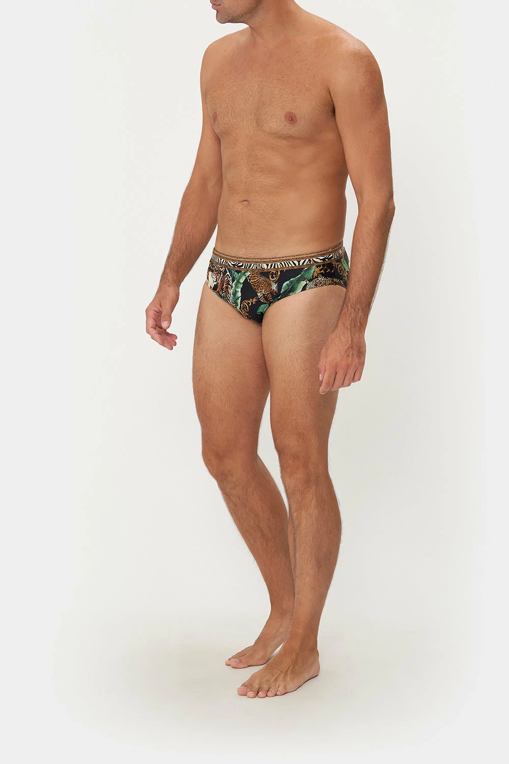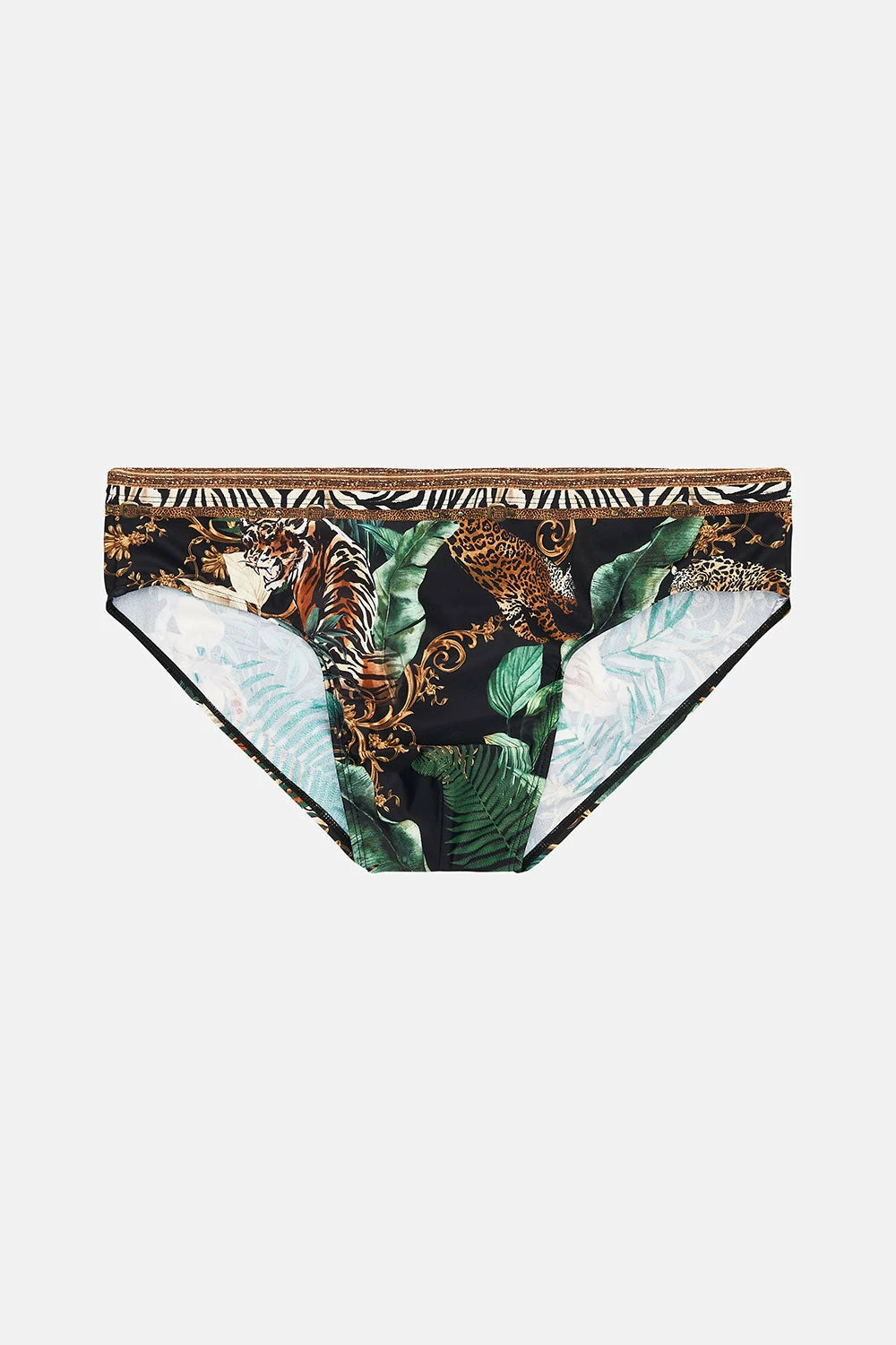 Exploring a cheekier side to sunlit scenes, our Easy Tiger Swim Brief is wrapped in midnight hues adorned with cascades of forest ferns, gold baroque detailing, ivory botanicals and the electric pounce of the tiger. Crafted for days spent by the sand and sea, this luxury mens swim brief features complete coverage, a low rise cut, customisable ties within the interior and a fitted silhouette that stretches for your perfect fit.