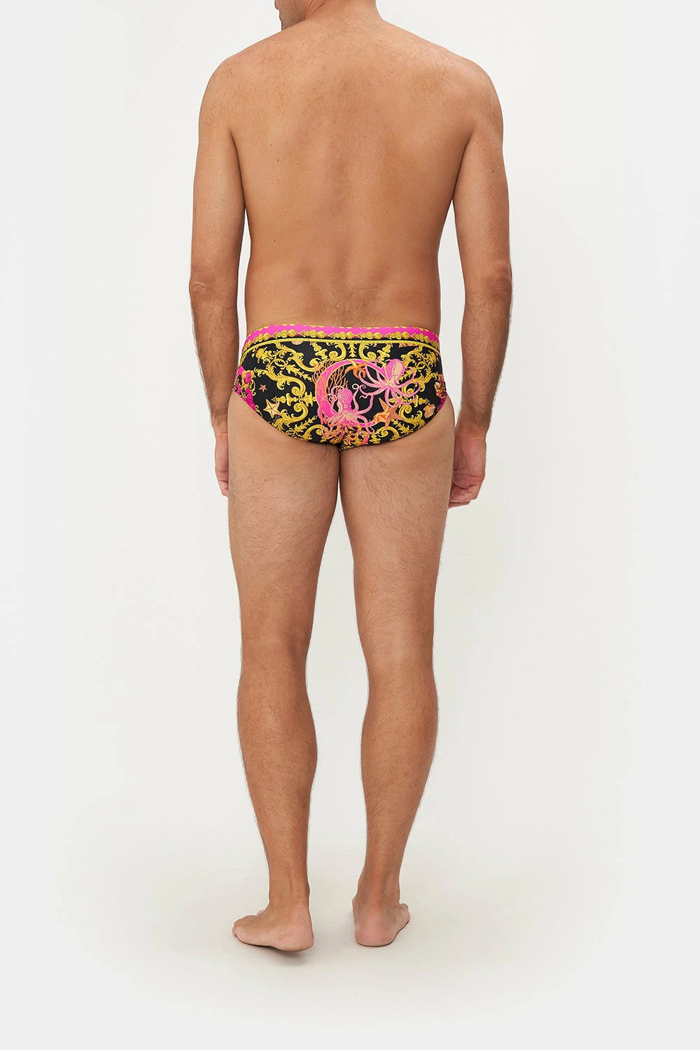 Wrapping beachside scenes with life beneath the sea, our Octopia Swim Brief speaks to a rich midnight hue defined by gold baroque cascades, vibrant octopus wrapped in neon-dipped fuchsias and ornaments of the sea glittering amongst it all. Crafted for days spent by the sand, this luxury swim brief features complete coverage, a low rise cut, customisable ties within the interior and a fitted silhouette that stretches for your perfect fit.