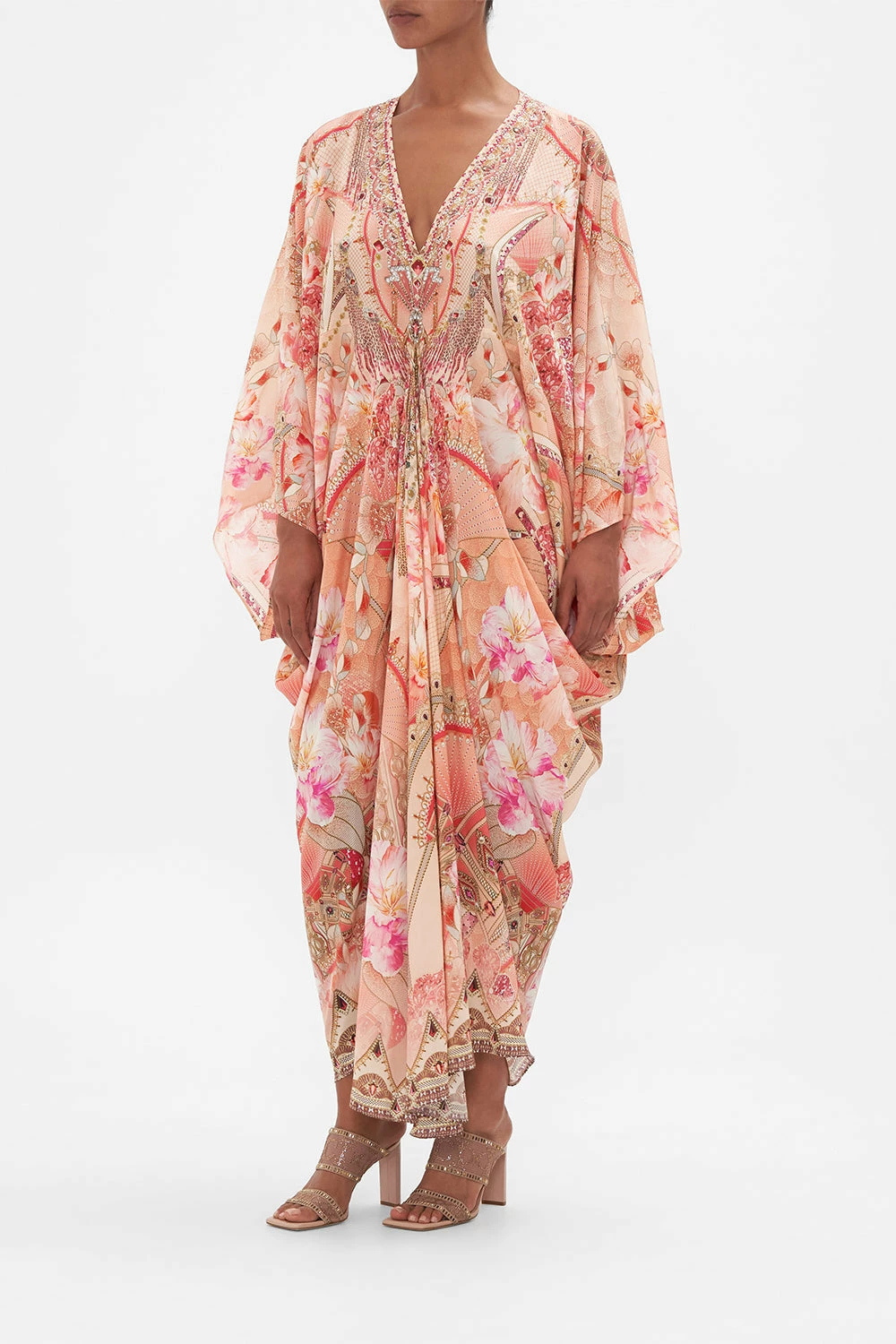 The Adore Me T Shape Long Kaftan embodies an arrangement of soft pink blooms set against delicate unfurling fans of pretty pearls and sparkling jewels. A dance of soft draping details that gently taper towards the hemline, this luxuriously floaty silk kaftan scintillates with CAMILLA crystal embellishments along the deep V neckline, a dramatic statement piece in an oversized relaxed fit maxi silhouette, that softly skims the ankles for glamourous day or night dressing. Lovingly handcrafted and designed in Australia, explore more from The Moral Of The Story: Act II collection.