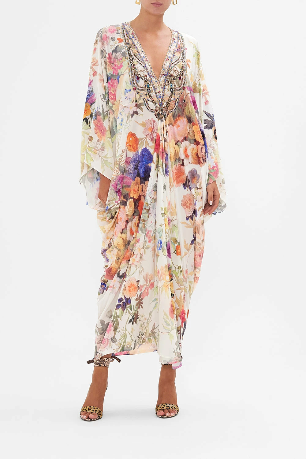 The Friends With Frescos T Shape Long Kaftan captures the exquisite ambiance of the grand Hotel Villa Cora. Soft flowing curves guide us along opulent mosaics in a rich tapestry of pretty florals and baroque accents. A dance of soft draping details that gently taper towards the hemline, this luxuriously floaty silk CAMILLA kaftan scintillates with crystal embellishments along the deep V neckline, a dramatic statement piece in an oversized relaxed fit maxi silhouette, that softly skims the ankles for glamourous day or night dressing. An elegant sundress for resort wear or elevated for more sophisticated soirees styled with CAMILLA accessories. Lovingly handcrafted, designed in Australia. Explore more from the Amore Mio collection.
