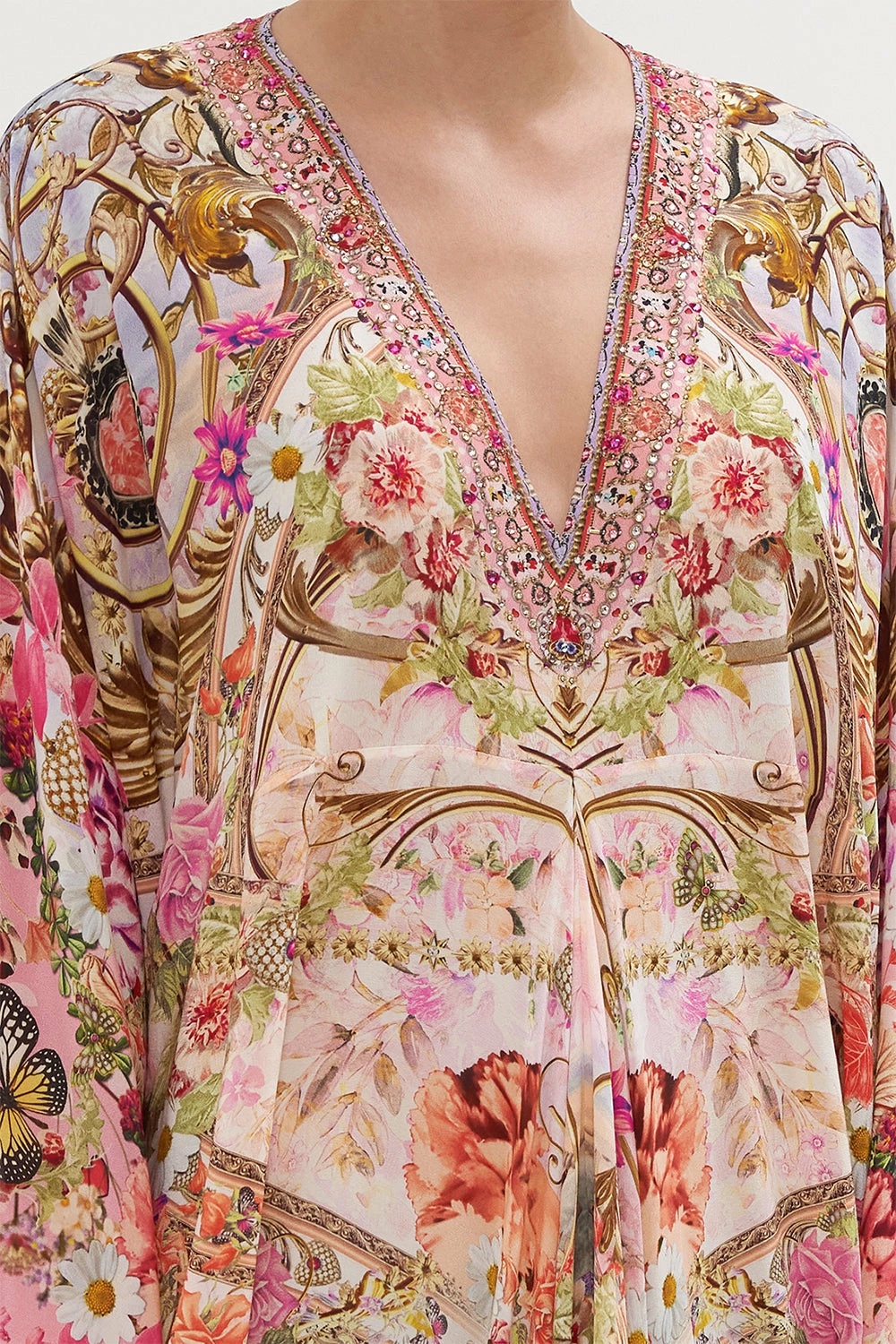 A limited edition treasure exclusive to our Disney | CAMILLA collaboration, the Minnie Mouse Magic T Shape Long Kaftan is awash with a sea of gentle pinks that adorn Mickey and Minnie in all their magic, the soft flutter of butterflies amidst carnations and golden baroque detailing.