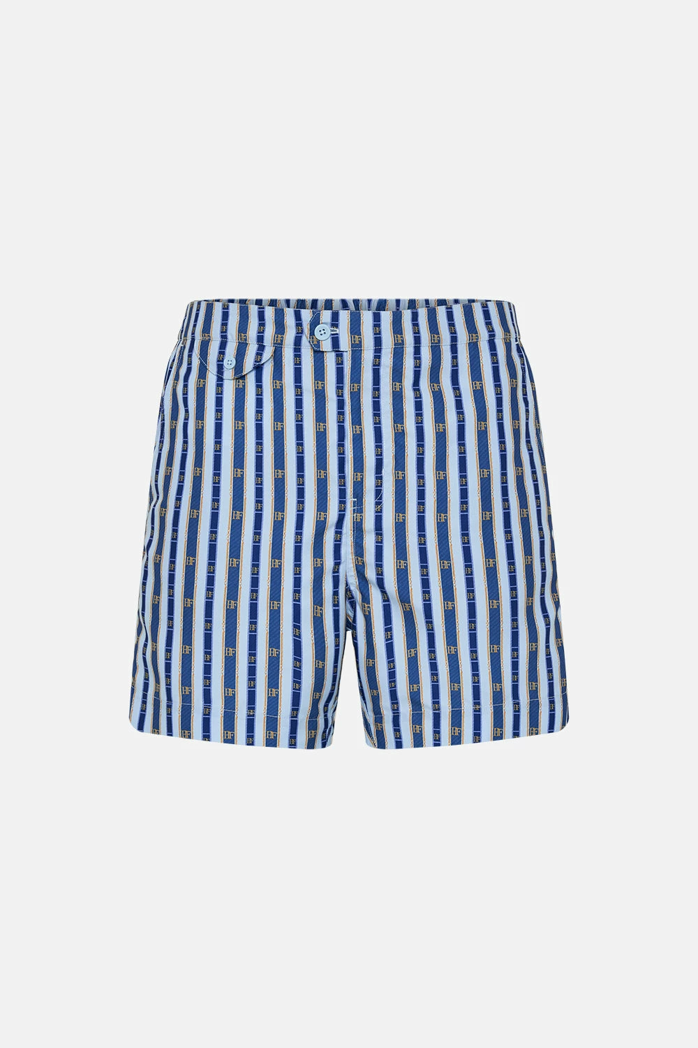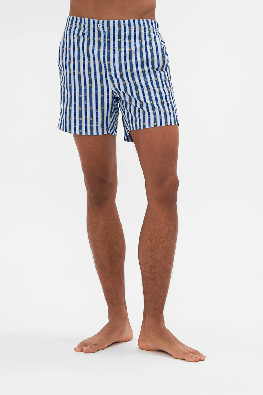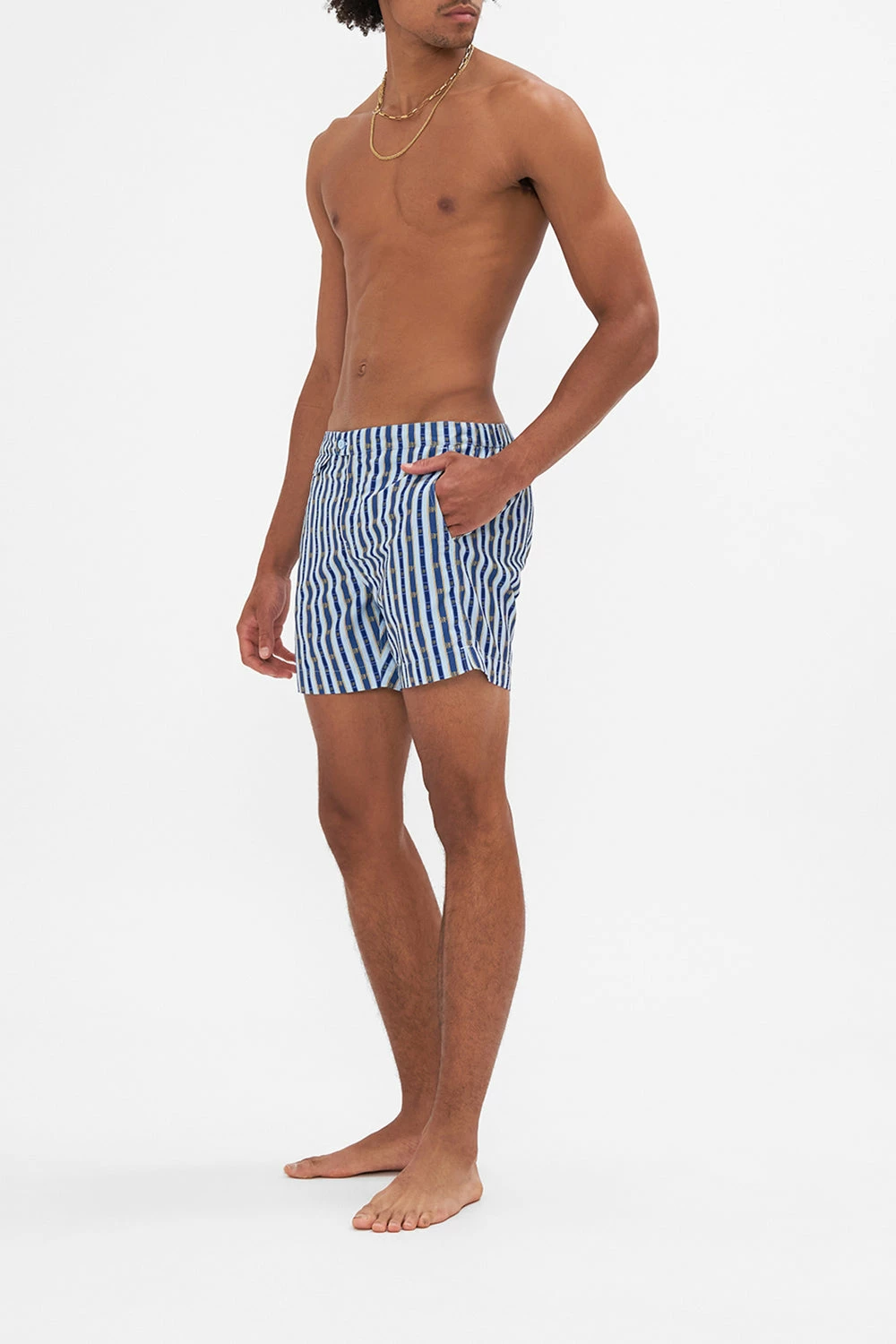 The Amalfi Lullaby Tailored Swim Short depicts the nautical exuberance of the Italian coastline, capturing the essence of seaside summer bliss. Crafted from recycled polyester retrieved from our seas, this luxury CAMILLA mens swim short sports an elasticated drawstring waist for a perfect fit, a relaxed short silhouette and a mesh interior for added lining. Lovingly handcrafted, designed in Australia, explore more from the Amore Mio collection.