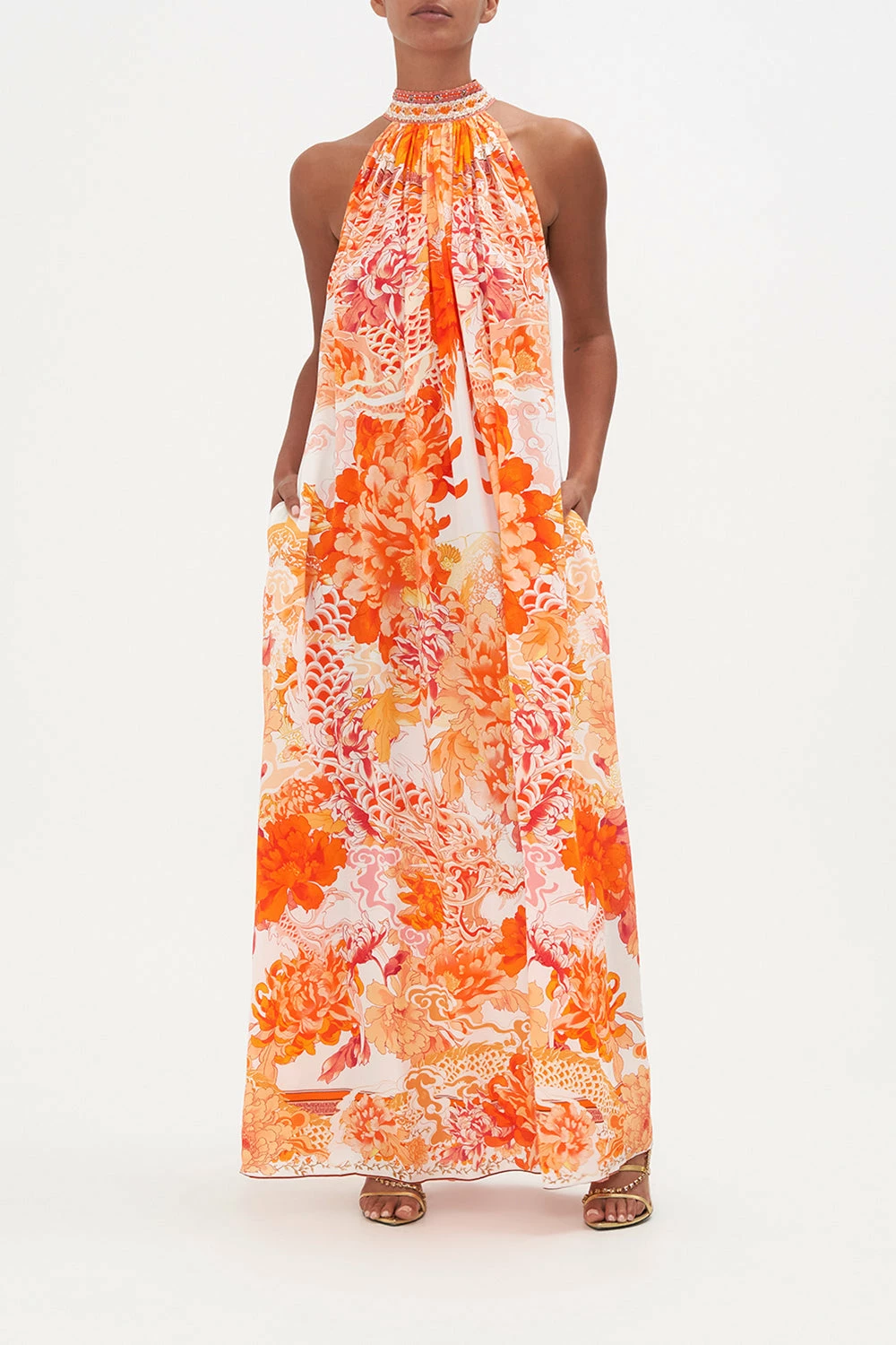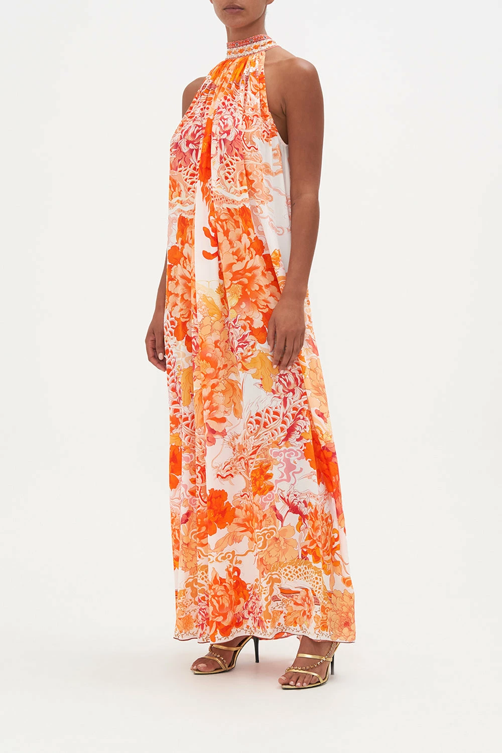 The Dragon Mother Tie Neck Long Dress captivates the gaze with a sea of sunset hues complete with blooming botanica, moments of utter vibrancy and the majesty of dragon dreamscapes. Adorning hand-embellished CAMILLA crystals, this luxury silk dress features a contrasting high neckline that falls into a gathered detail, a relaxed longline silhouette and dainty tie accents. Create shape at the waist with the addition of a belt.