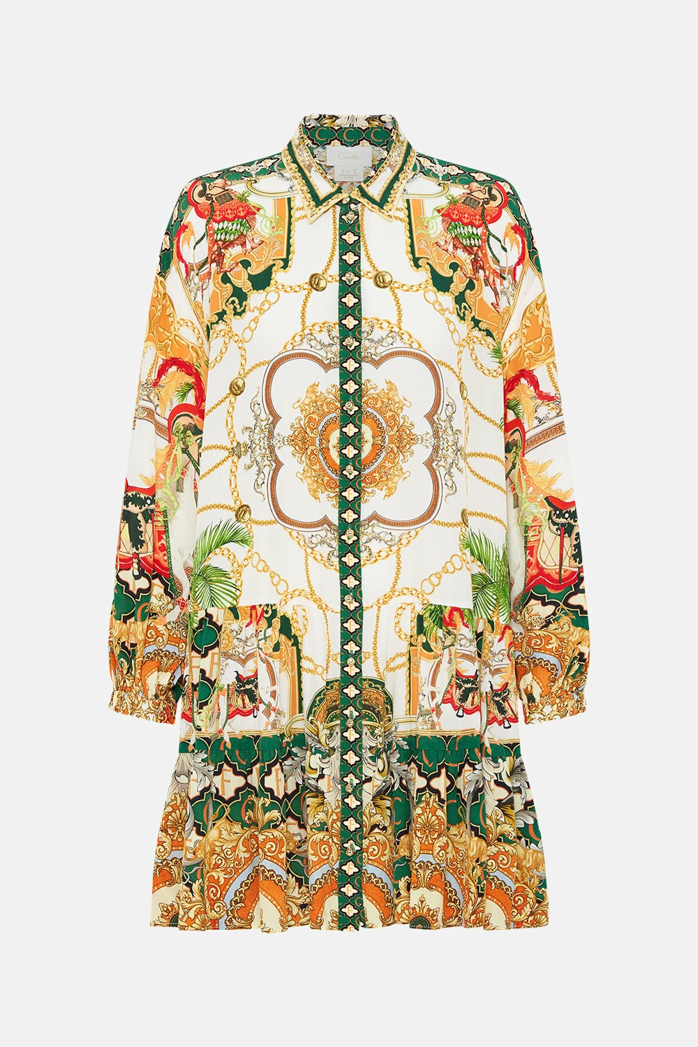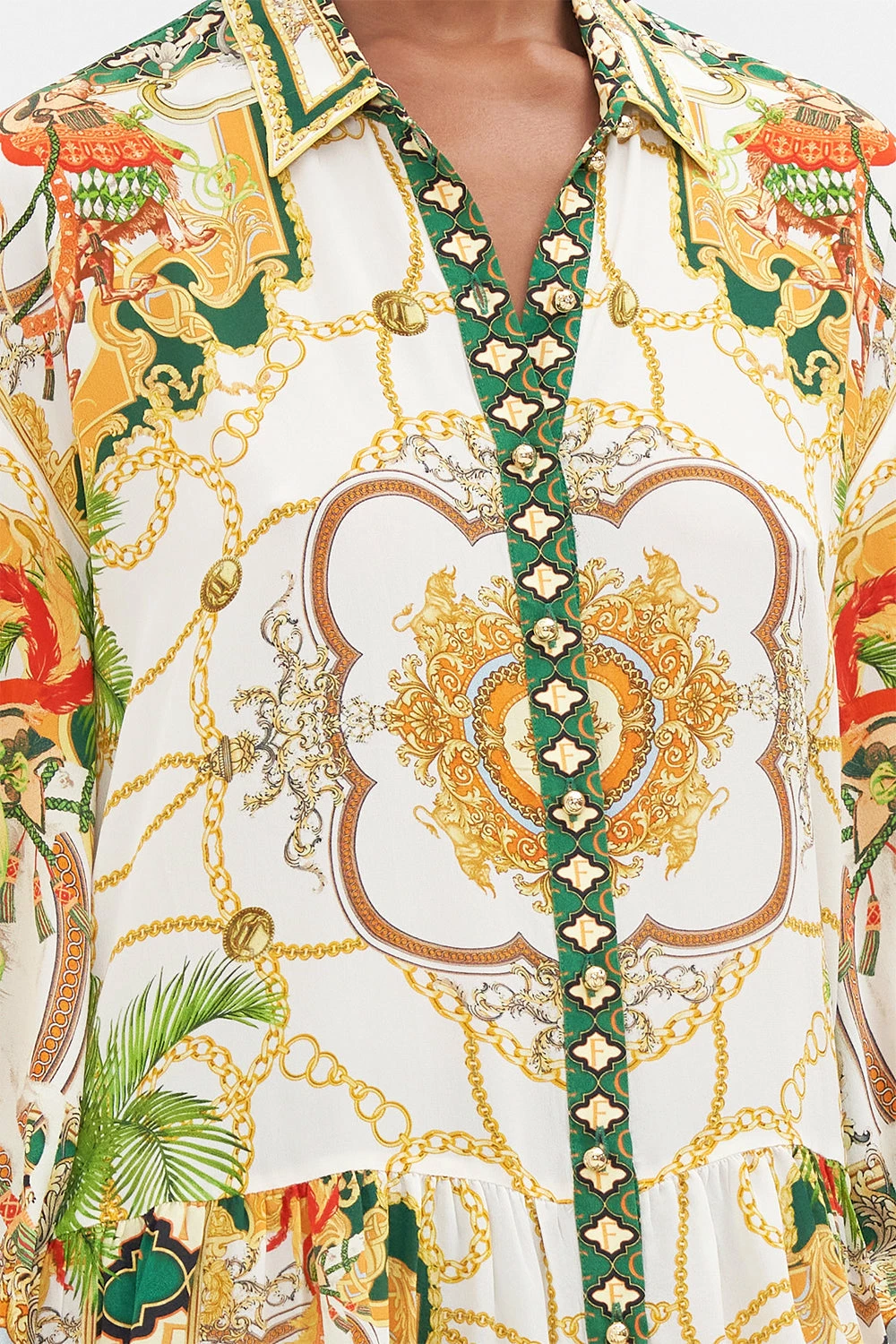 My Sweet Devotion Tiered Shirt Dress glides into a world of elegant palatial curves boldly outlined in geometric mosaics. Gold regal motifs dance in amongst lions and stallions, intertwined with golden chains and lush emerald green foliage against porcelain white. Crafted from sumptuous silk, this luxury dress is home to vivaciously voluminous blouson sleeves, button down enclosure, a delicately tiered hemline, hints of soft tailoring at the collar and hand-embellished CAMILLA crystals. Lovingly handcrafted and designed in Australia, explore more from The Moral Of The Story: Act II collection.