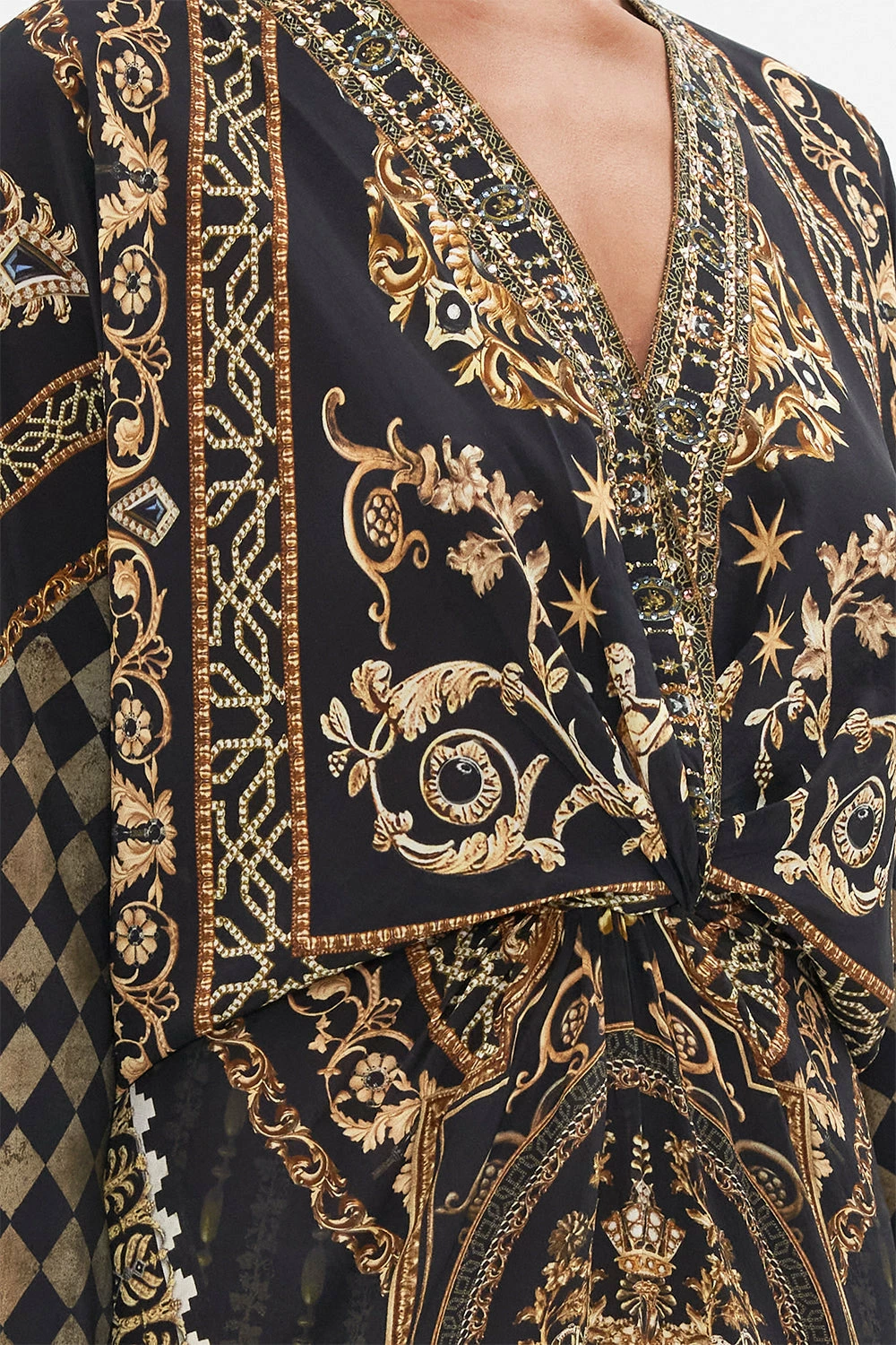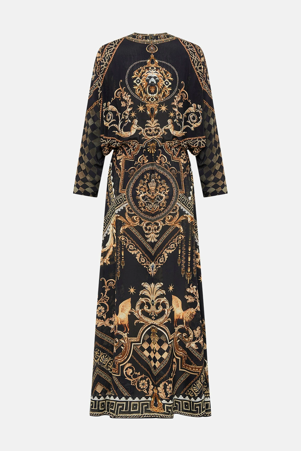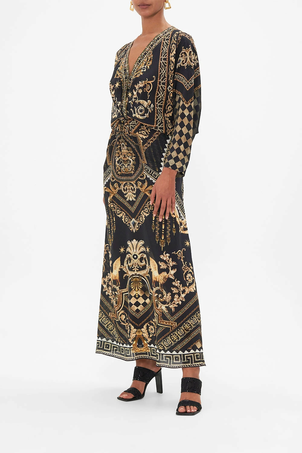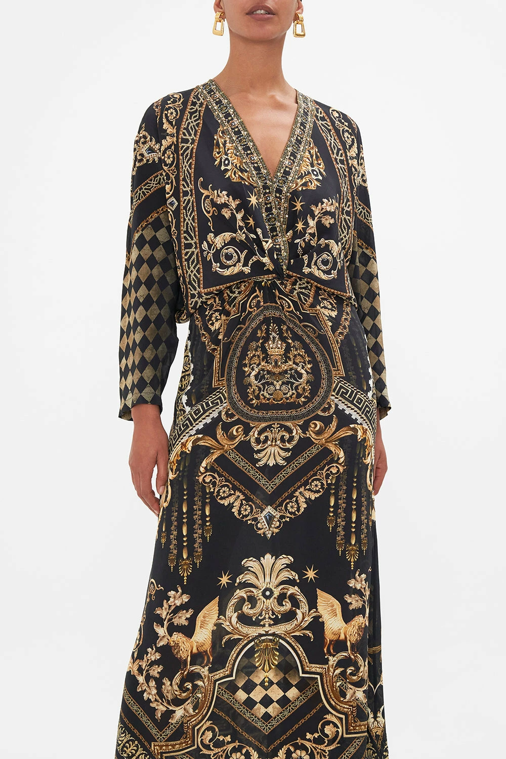 The Duomo Dynasty Twist Front Batwing Dress is a symphony of sculptural palatial curves. A striking mosaic of onyx and gold highlights the glimmering gold charms and royal crests imbued in myth and magic. A luxurious silk occasion dress with a decadent twist-detail at the front that meets crystal embellishments at the décolletage, long batwing sleeves and a relaxed silhouette that dances into a maxi hemline. The perfect dramatic day dress or worn as an elegant evening dress. Lovingly handcrafted, designed in Australia. Explore more from the Amore Mio collection.
