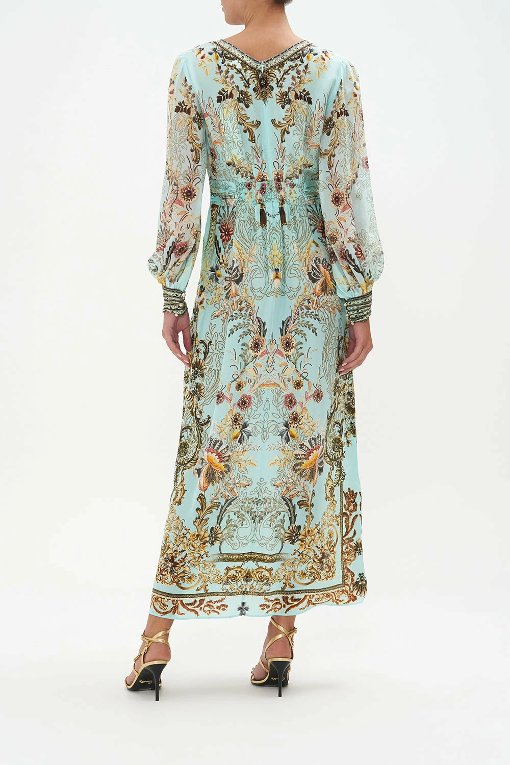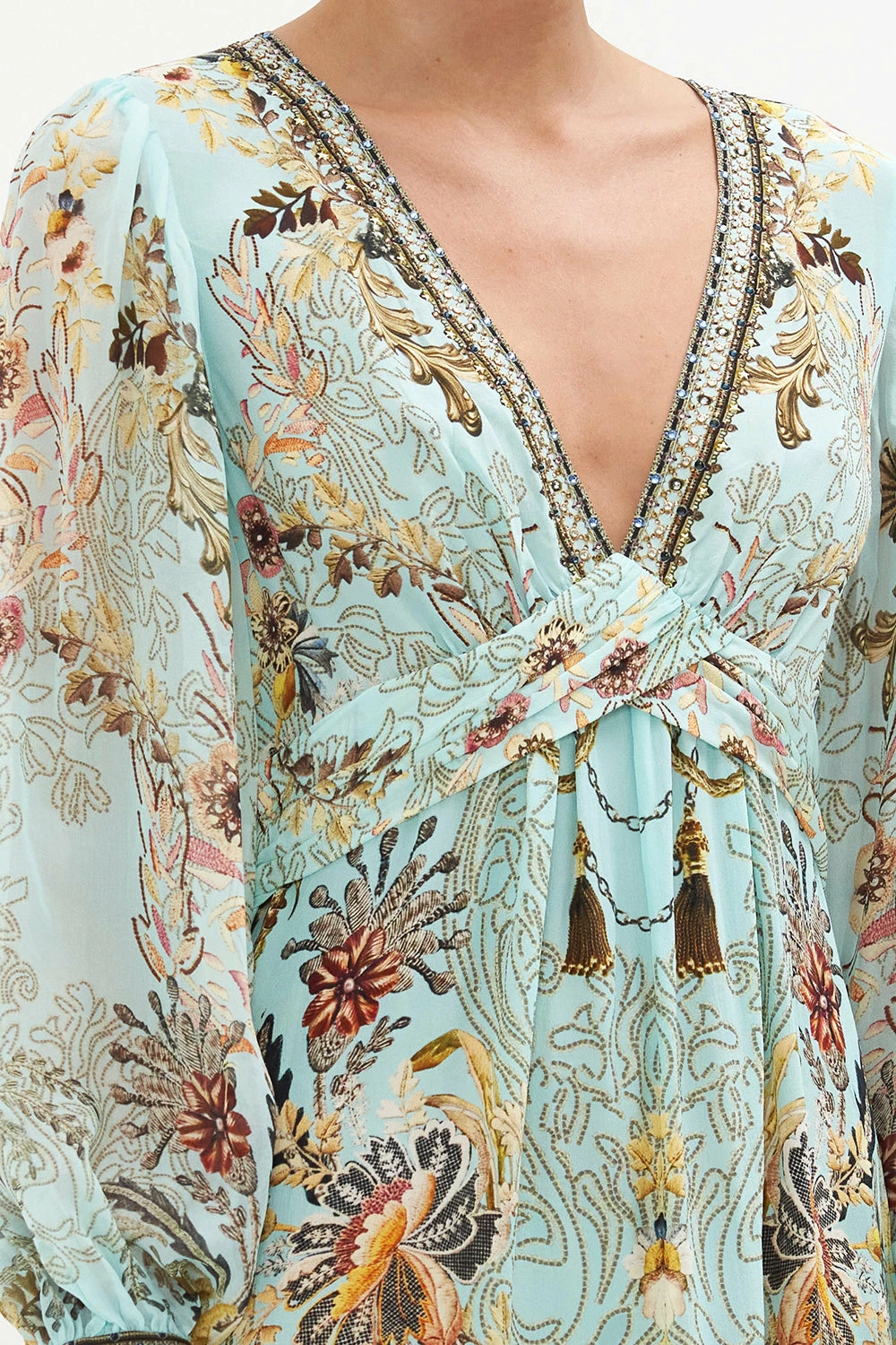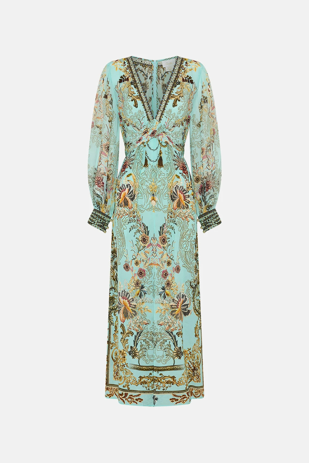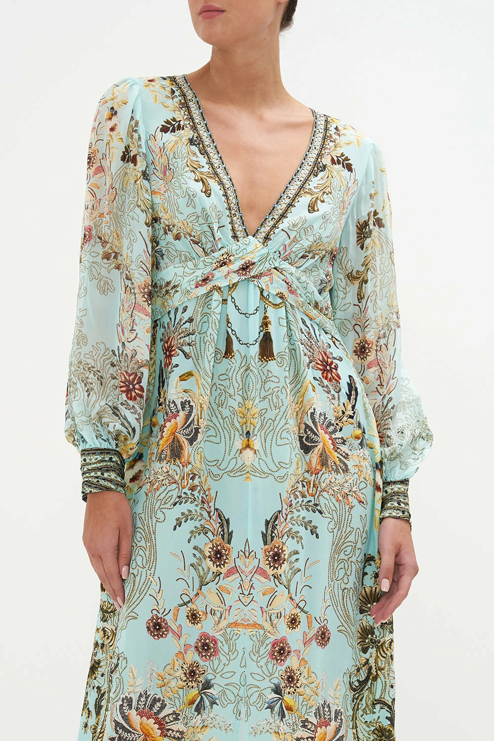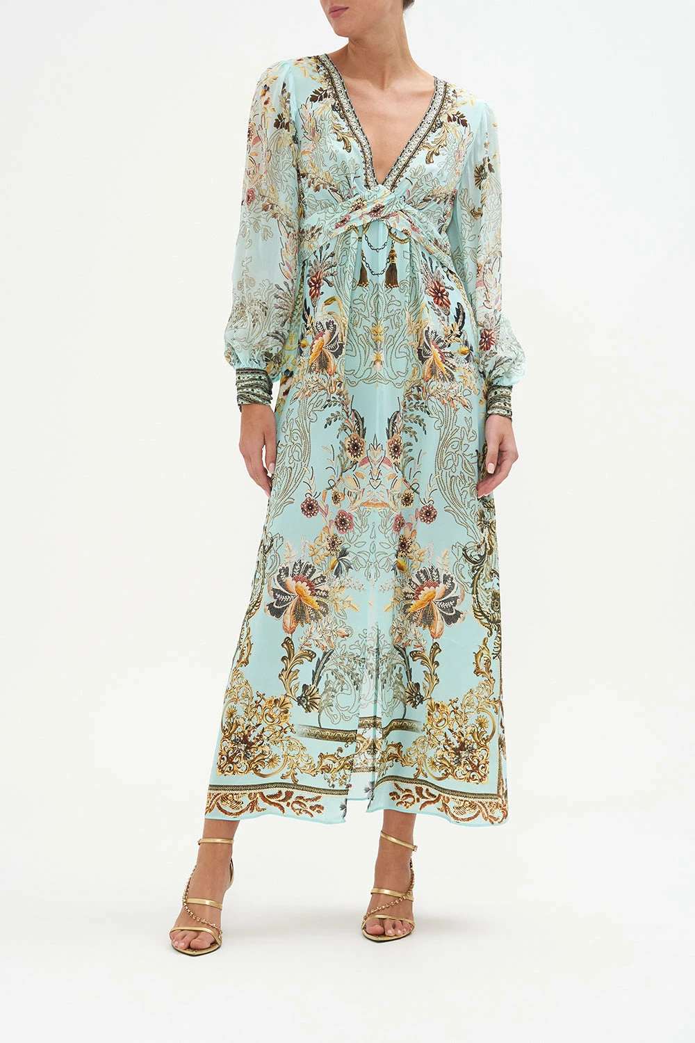 The Adieu Yesterday Twist Front Long Dress explores a mesmorising sea of celestial blue hues finished with ornate golden swirls that dance alongside decadent botanical details and exquisite chain cascades. Crafted from the softness of silk, this luxury occasion dress is home to a decadent twist-detail at the bust that meets hand-embellished crystals at the décolletage, a dainty blouson sleeve and a relaxed silhouette that dances into a maxi hemline.