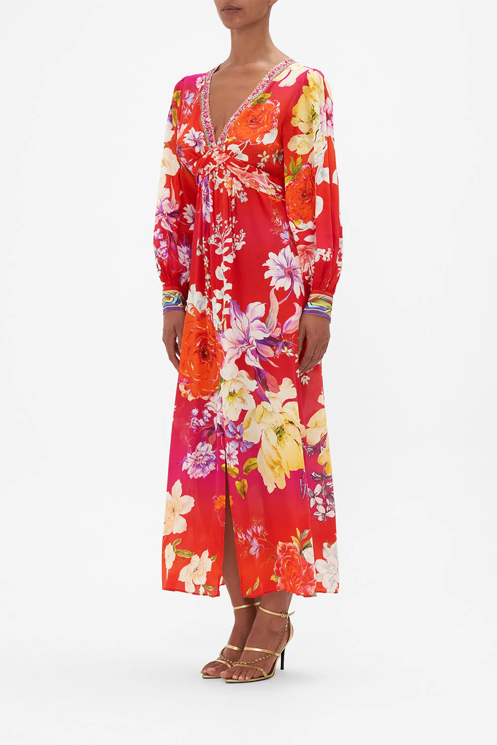 The Kiss & Tell Long Twist Front Dress invokes striking beauty with delicate florals awashed in vibrant hues of pinks and rouge. Crafted from the softness of silk, this luxury occasion dress is home to a decadent twist-detail at the bust that meets hand-embellished crystals at the decolletage, a dainty blouson sleeve and a relaxed silhouette that dances into a maxi hemline. Lovingly handcrafted and designed in Australia, explore more from The Moral Of The Story: Act II collection.