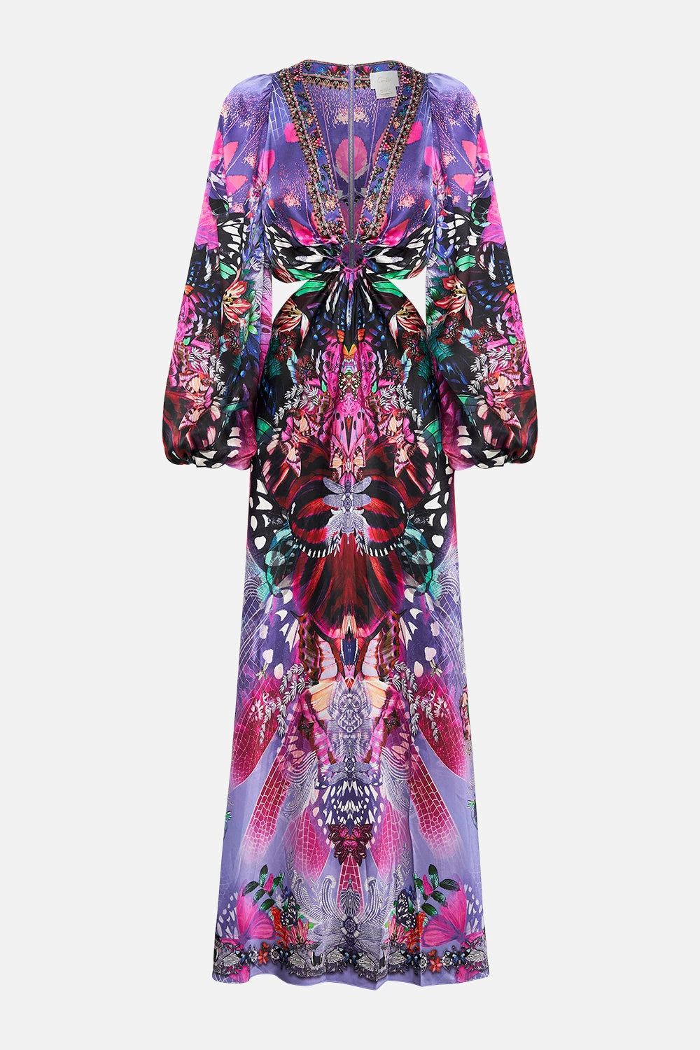 Tantalising occasionwear immersed in the wonders within our gardens, the Indira U-Ring Cut Out Dress is encased by a rich lavender hue enveloped by the flutter of butterflies, petals of magenta and cascades of ivory intricacies. Crafted from signature CAMILLA silk, this statement occasion dress features a billowy blouson sleeve, hand-embellished crystals, subtle cut-outs at the waistline, hardware detailing and a relaxed maxi silhouette.