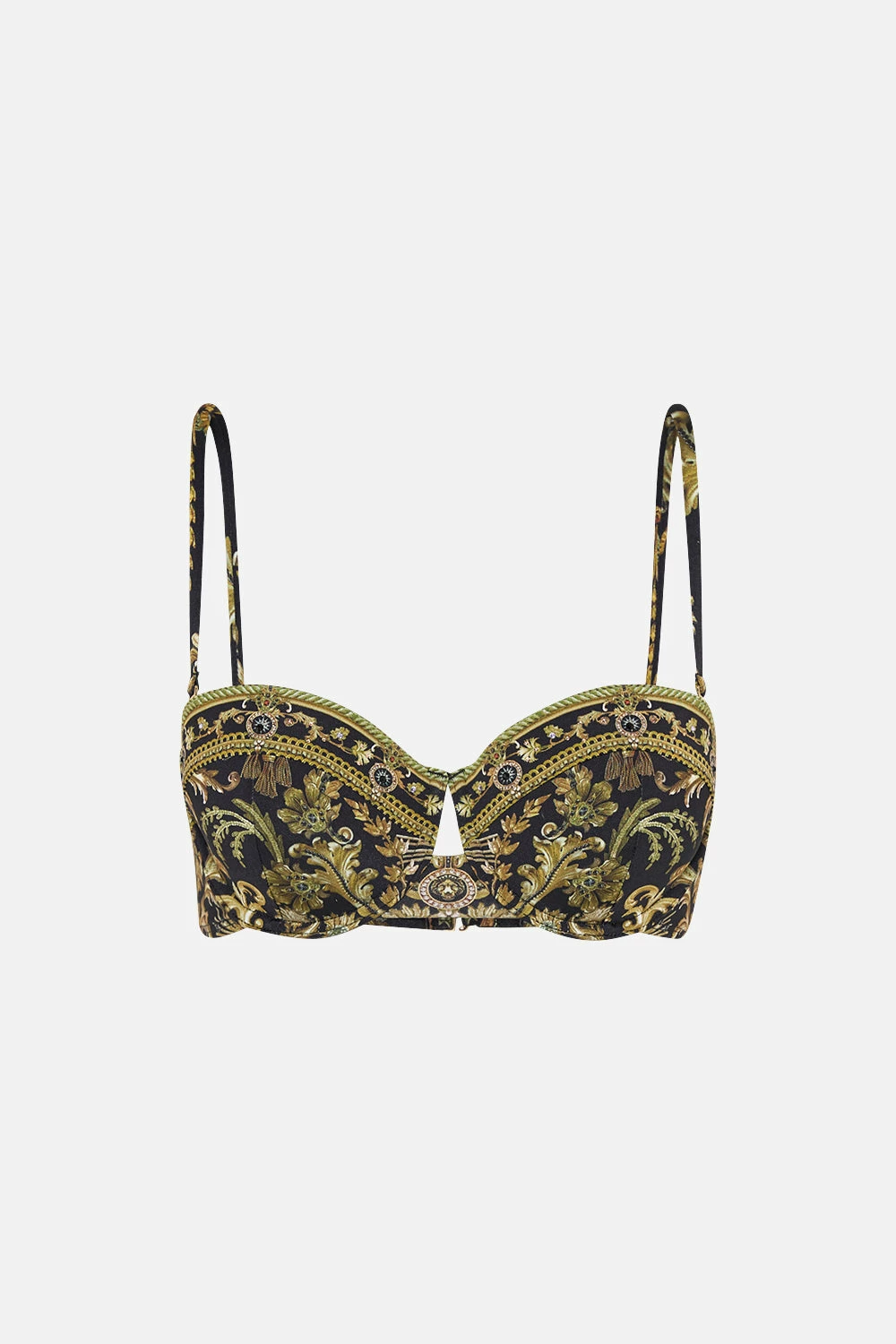 The Night Is Noir Underwire Bra explores a mesmorising sea of midnight hues finished with ornate golden swirls that dance alongside decadent botanical details and exquisite chain cascades. Crafted from ECONYL® regenerated nylon, this sustainable bikini top features hand-embellished CAMILLA crystals, underwire support, detachable straps and dainty cut-out details.