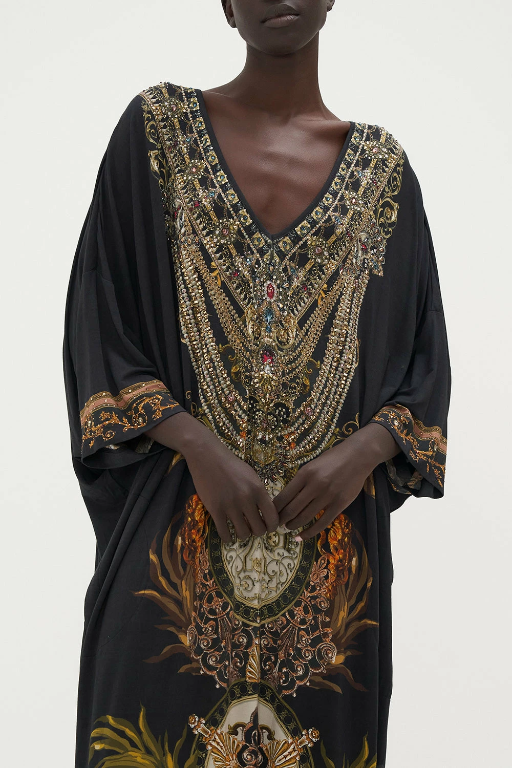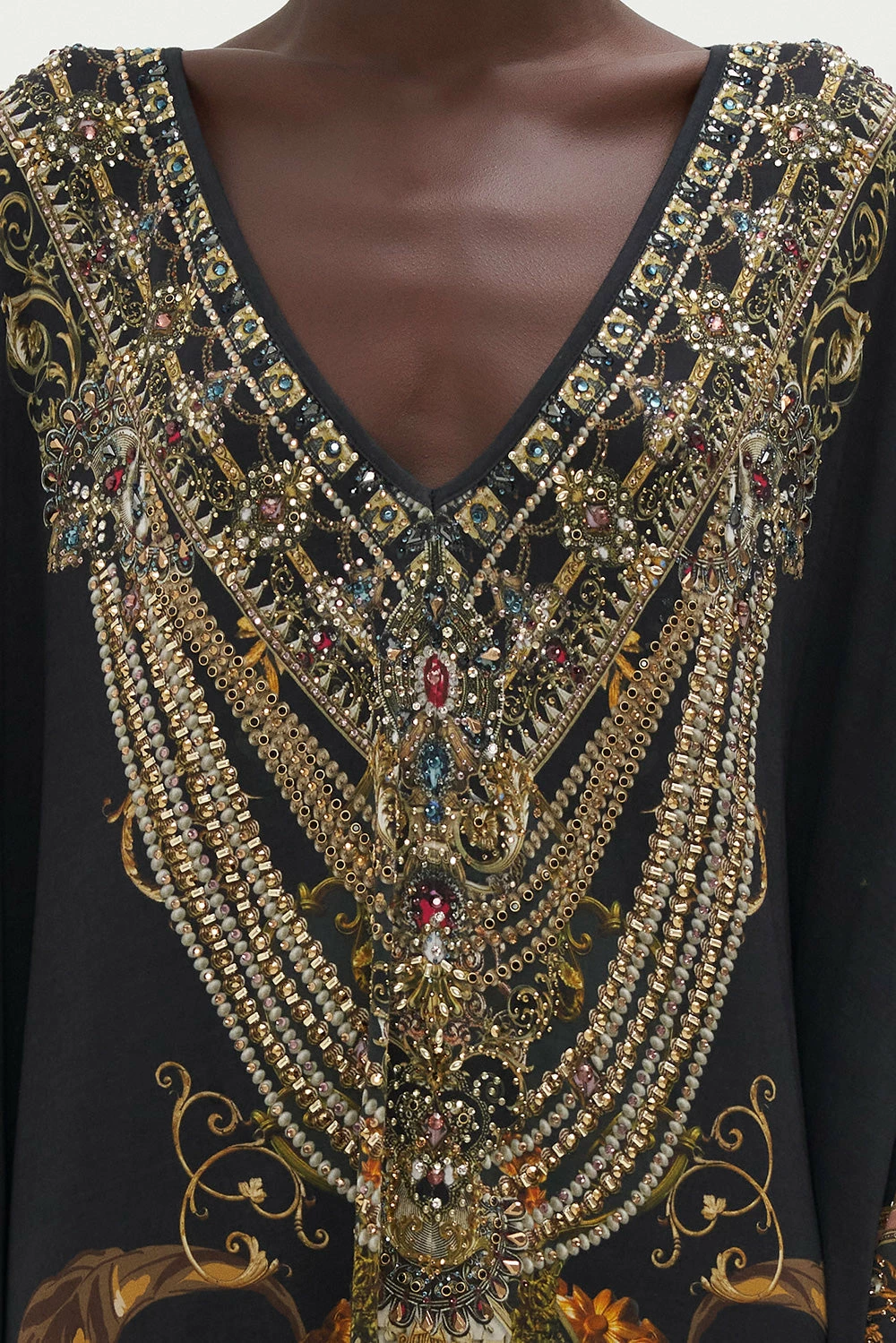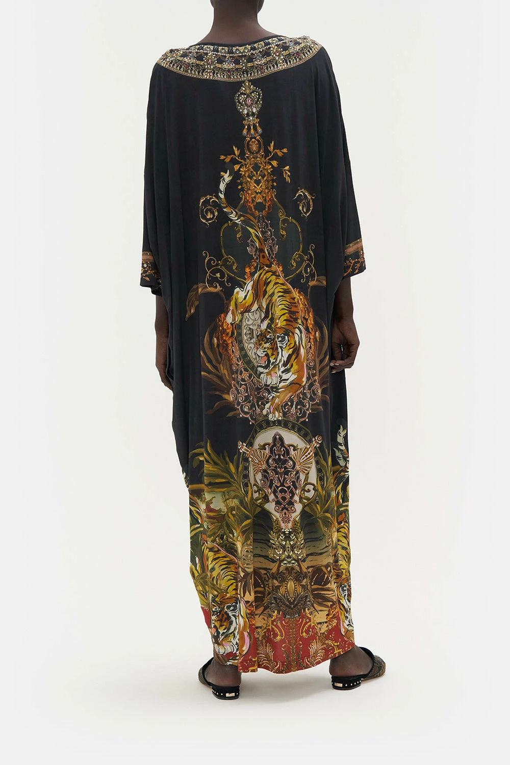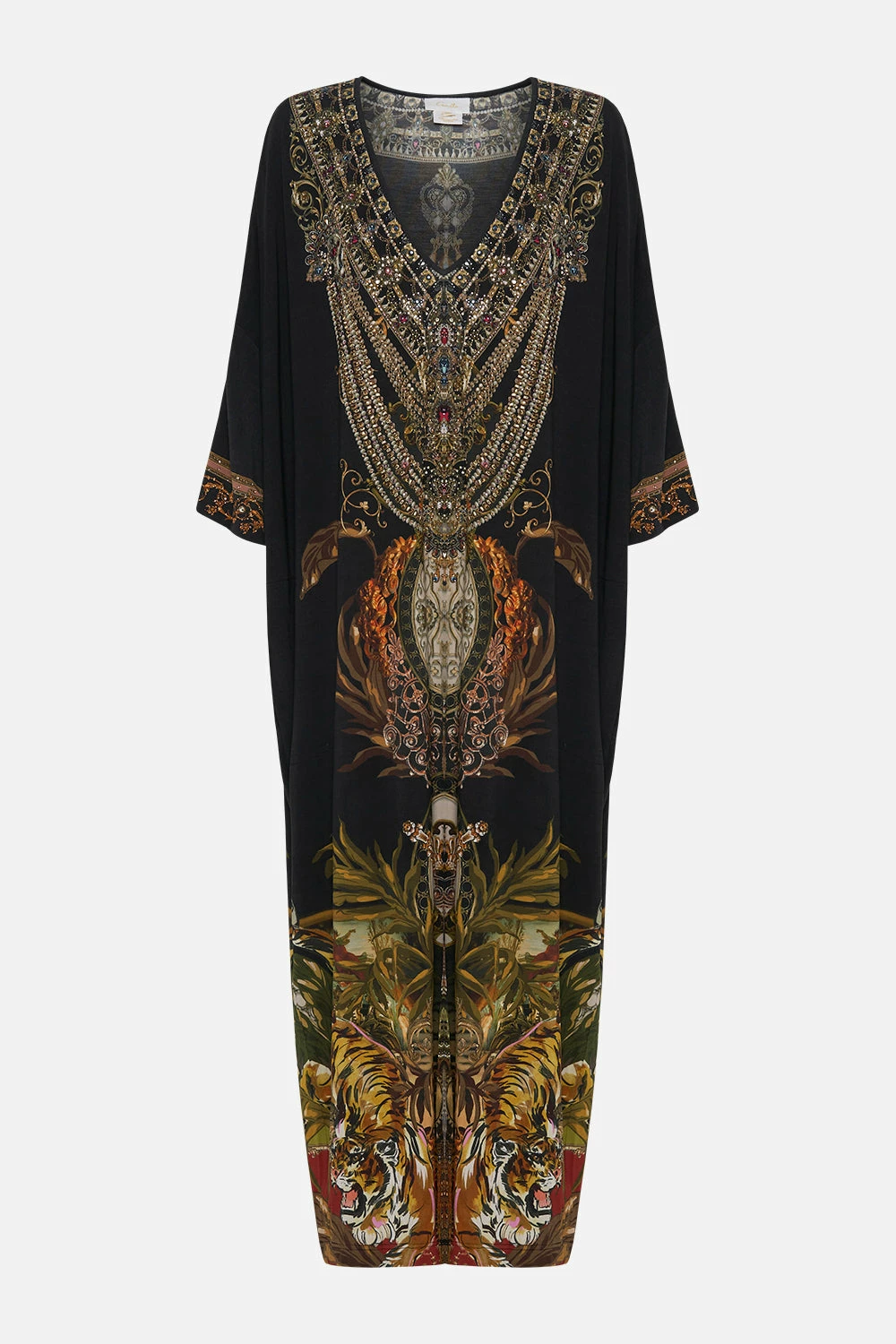 Our signature treasure immersed in wild animalia, The Queens King V Neck Batwing Kaftan explores an intricate mosaic of tigers stalking a sea of midnight, baroque accents and leafy details dipped in utter opulence. Complete with hand-embellished CAMILLA crystals, this luxury kaftan features a deep v neckline, statement batwing sleeves and a relaxed maxi silhouette.