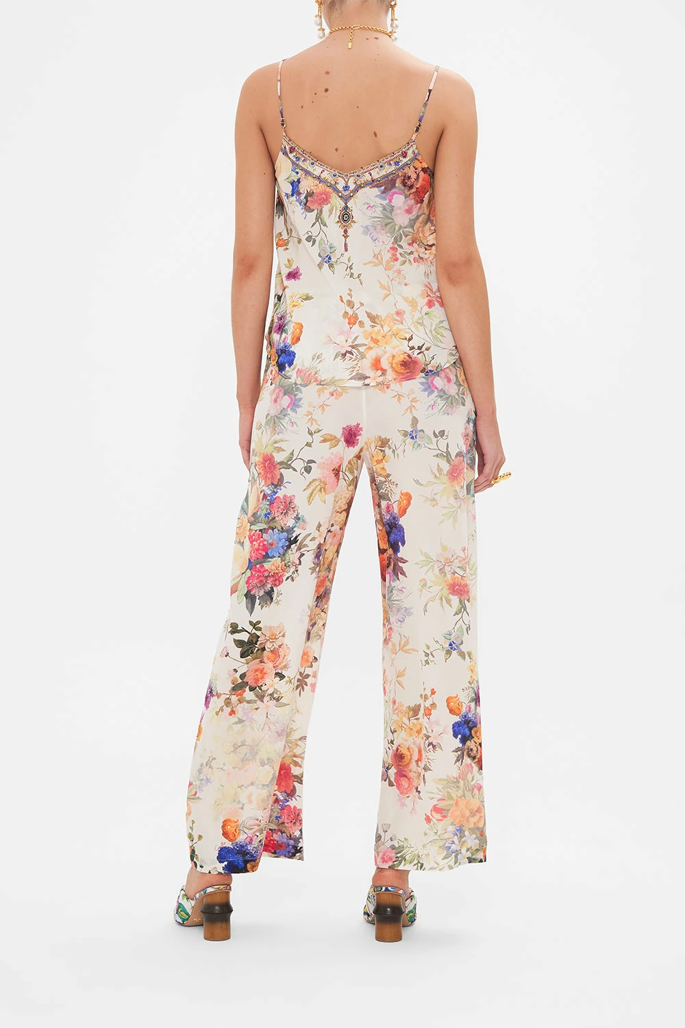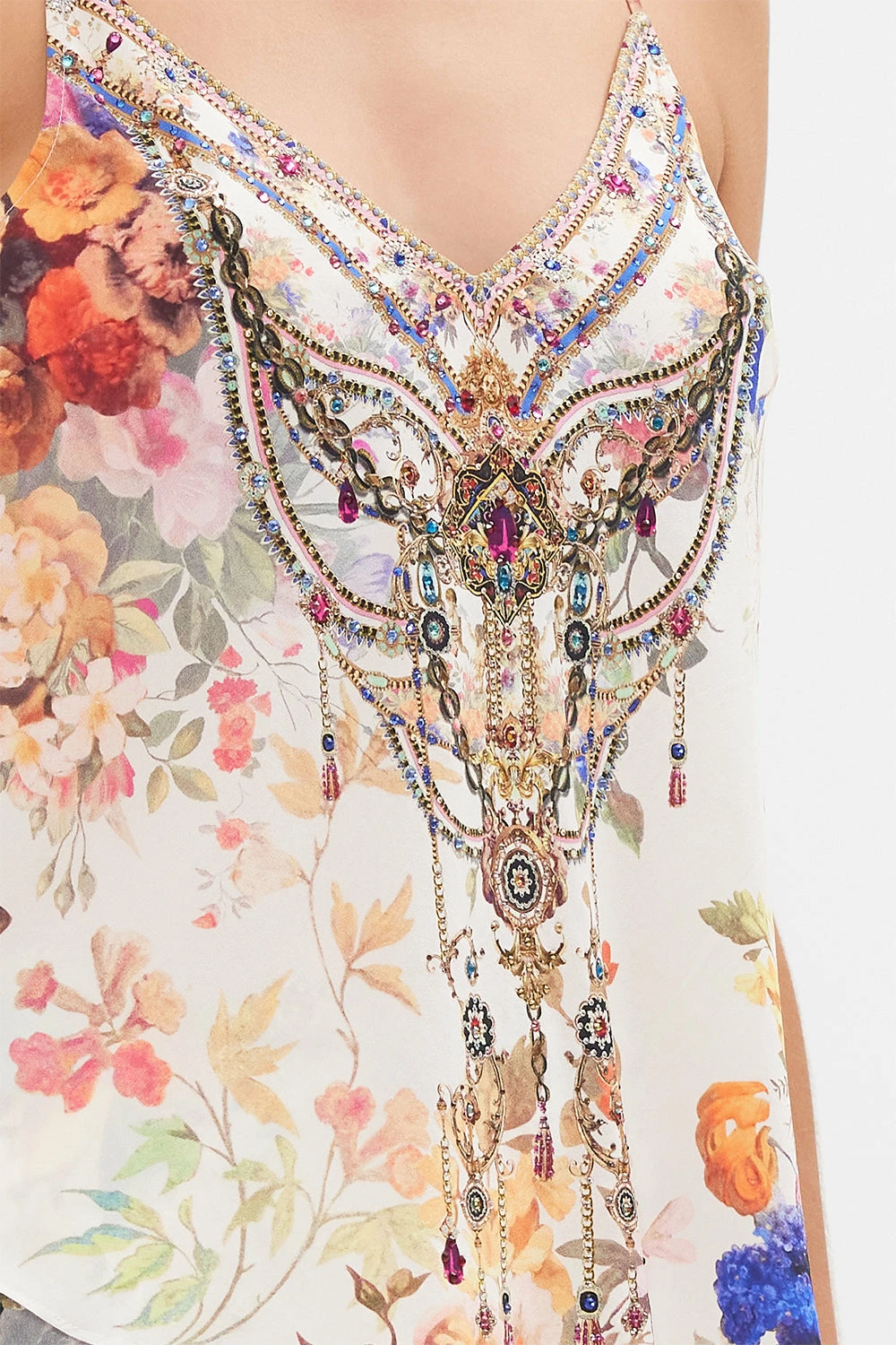The Friends With Frescos V Neck Bias Cami captures the exquisite ambiance of the grand Hotel Villa Cora. Soft flowing curves guide us along opulent mosaics in a rich tapestry of pretty florals and baroque accents. Adorning signature CAMILLA crystals, this luxury silk camisole plays host to a soft v neckline that falls into a relaxed bodice and flared hemline, an on-the-bias silhouette that skims the curves with a tantalising low back detail and adjustable rouleau straps. Pair back with the Friends With Frescos Maxi Wrap Skirt for opulent fit and flare finesse. Lovingly handcrafted, designed in Australia. Explore more from the Amore Mio collection.