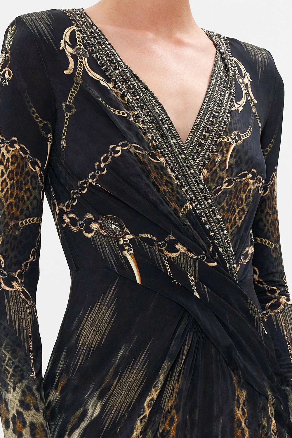 The Jungle Dreaming V Neck Cross Front Dress is a tantalising vision of wild animal and tribal inspired geo patterns. A melding arrangement of glimmering chains, charms and topaz highlights. Adorning hand-embellished crystals, this luxury mini dress is home to a deep v neckline dipped in scintillating CAMILLA adornments, a fitted cropped silhouette and draped details that wrap the waist in sensational shape. Lovingly handcrafted and designed in Australia, explore more from The Moral Of The Story: Act II collection.