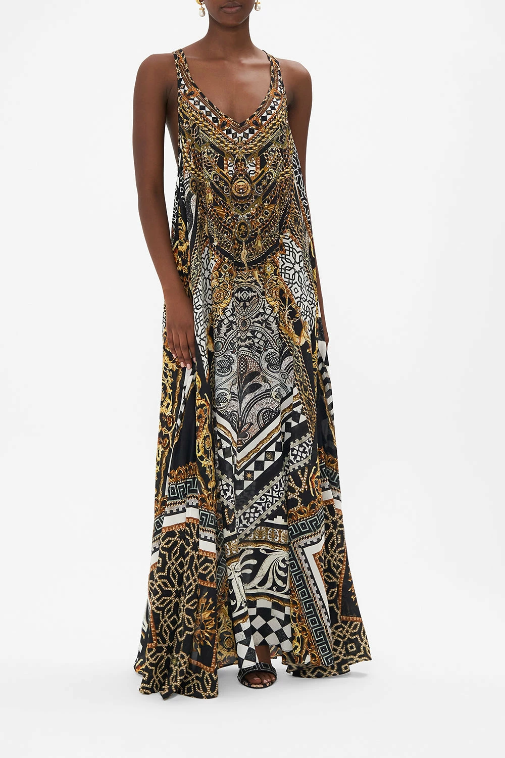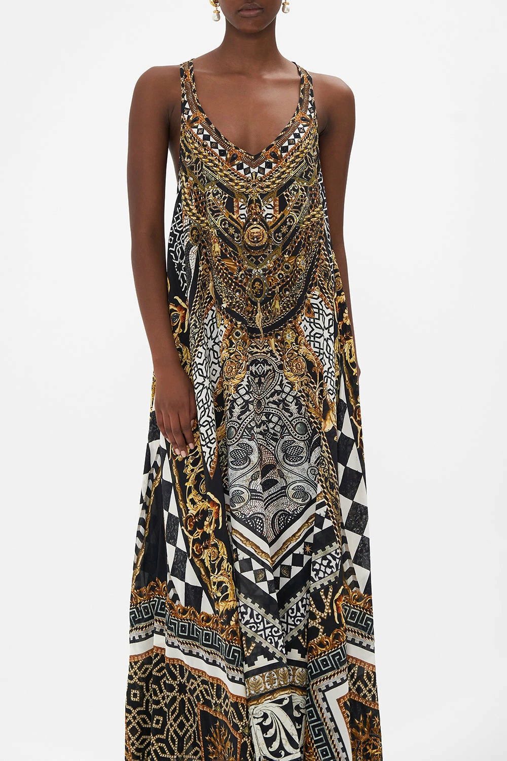 The Look Up Tesoro V Neck Racerback Dress embodies a striking mosaic of bold graphic borderlines that dance with the opulence of gilded baroque filigree. A timeless CAMILLA silk maxi dress featuring a deep v neckline adorned in crystal embellishments, sleek cutaway racer back details, and a relaxed maxi silhouette. Beautifully versatile wearable as a resort wear sundress or elevated for special occasions with lavish CAMILLA accessories. Lovingly handcrafted, designed in Australia. Explore more from the Amore Mio collection.