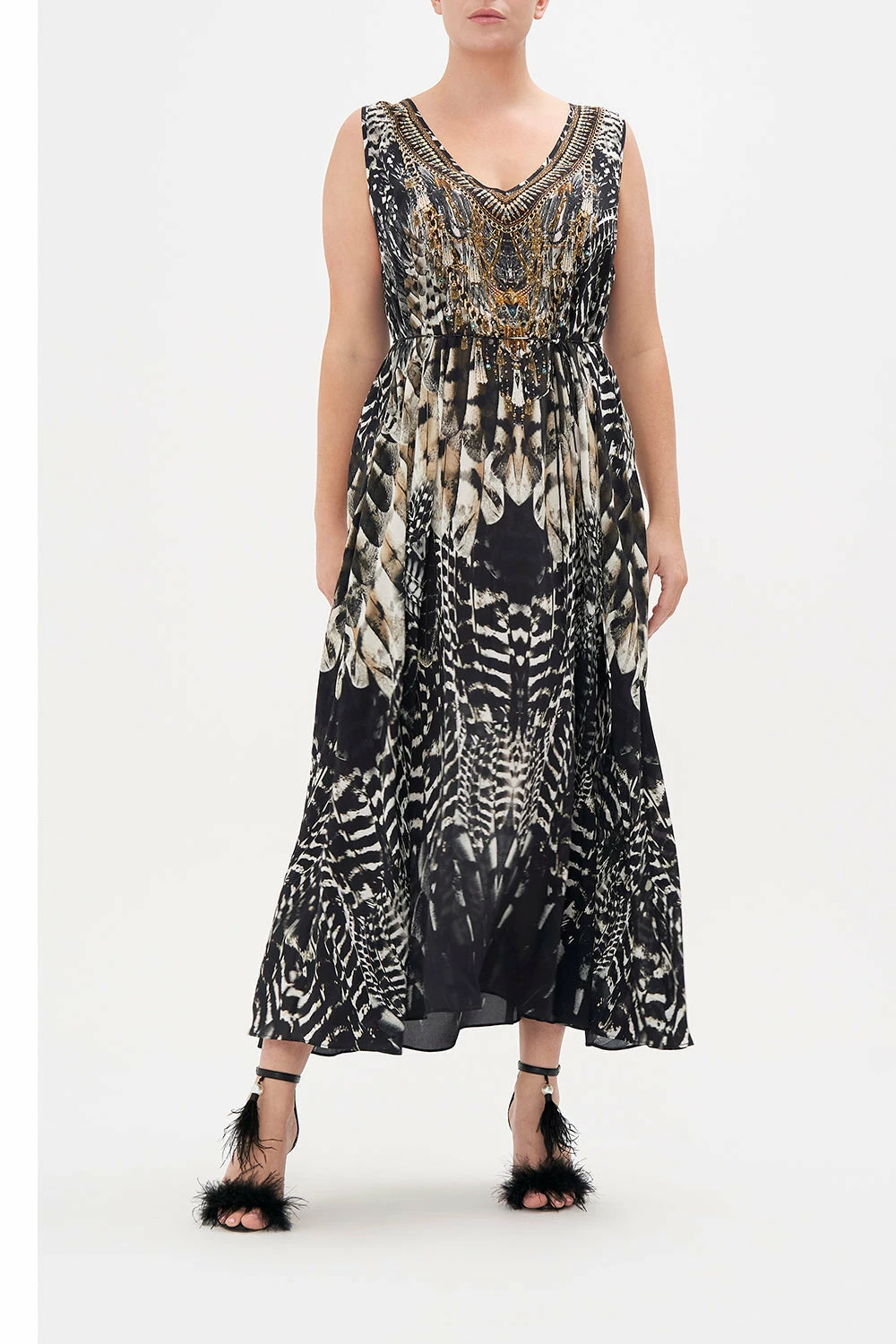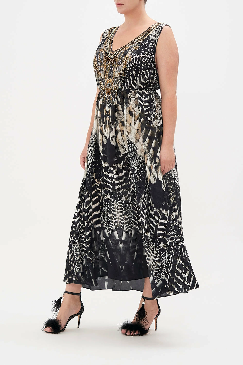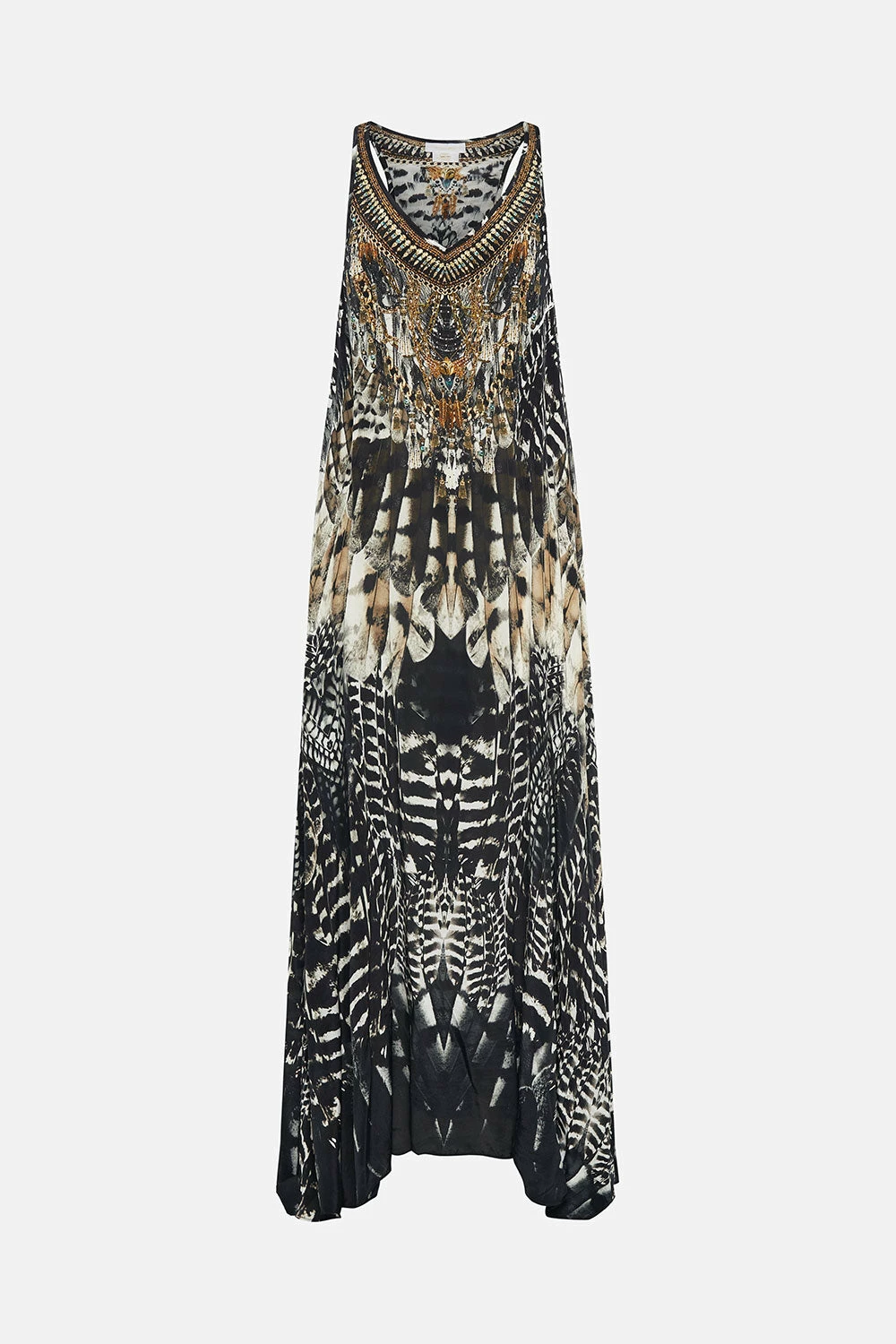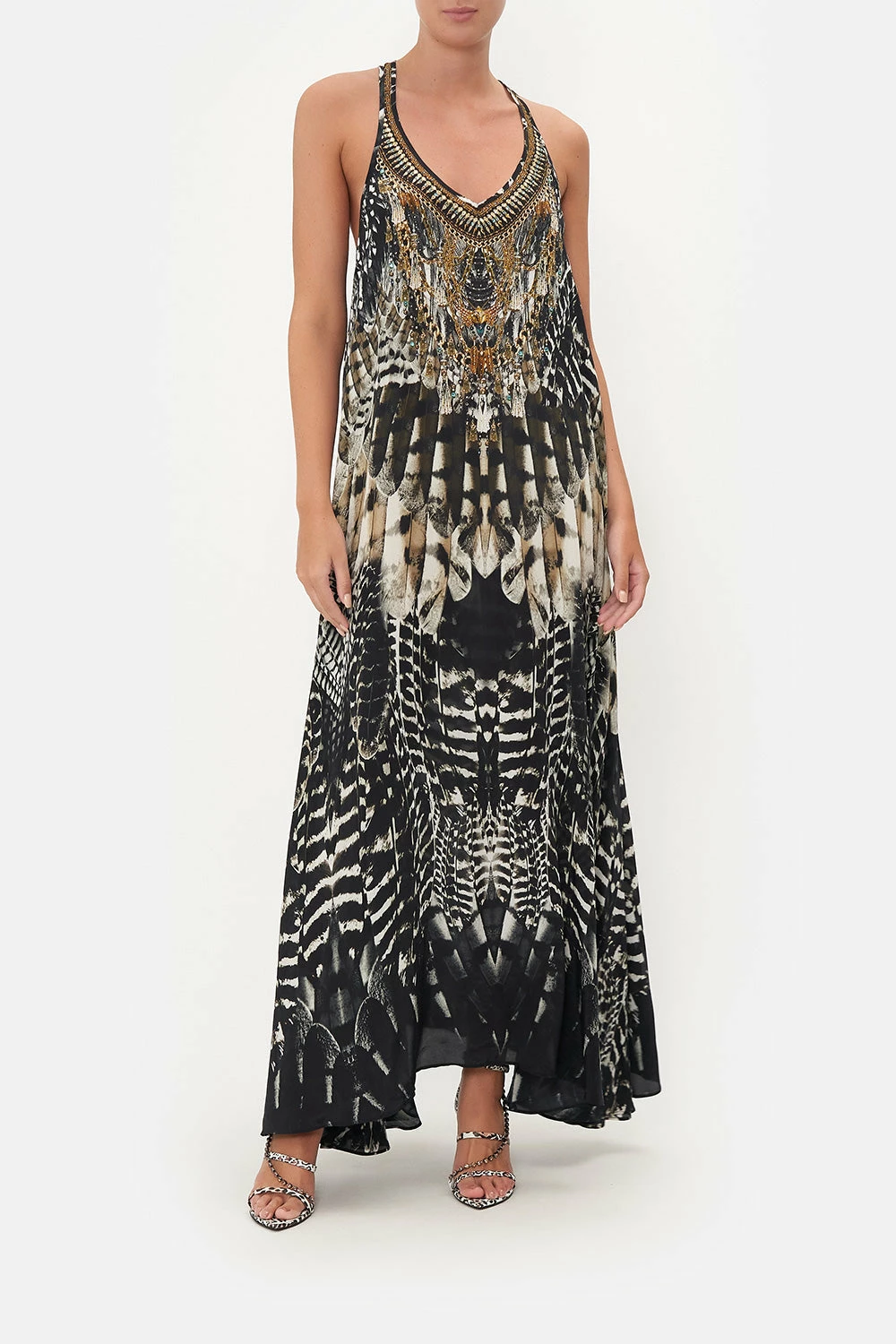 For the elevated moments within your everyday, the Night Owl V Neck Racerback Dress is enveloped by a deep midnight hue adorned with cascades of ivory featherings, moments of mocha and wispy white owl details. Crafted from signature CAMILLA silk, this luxury dress plays host to a deep v neckline adorned in hand-embellished crystals and a relaxed maxi silhouette.