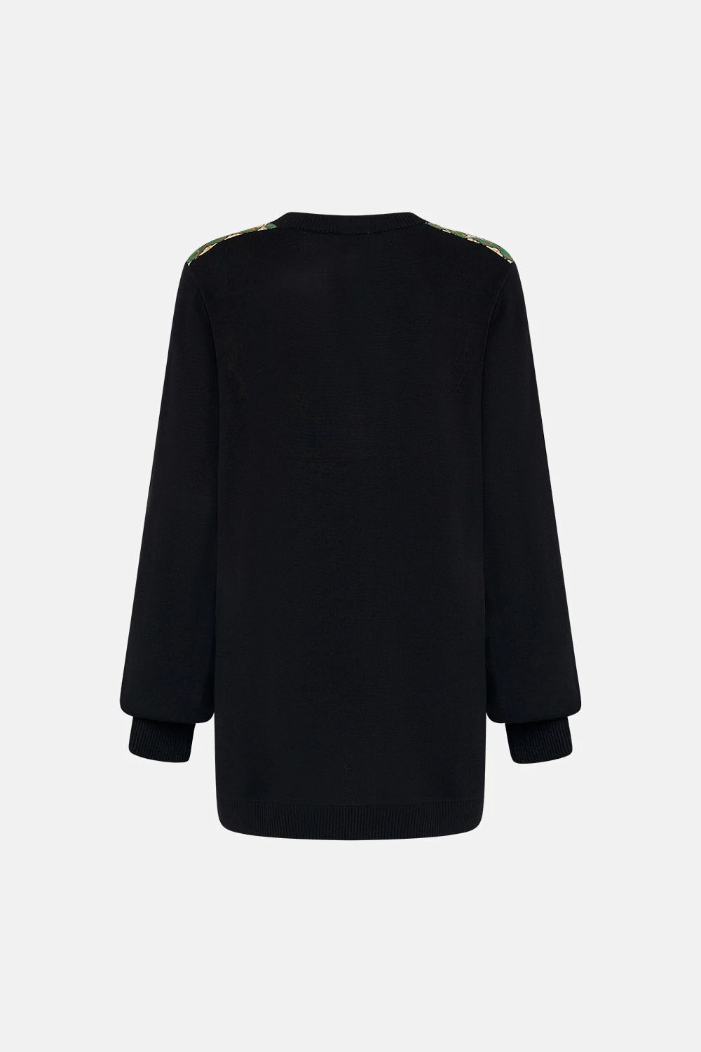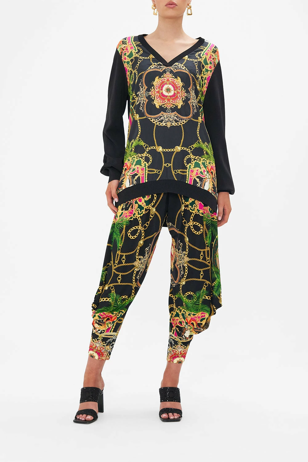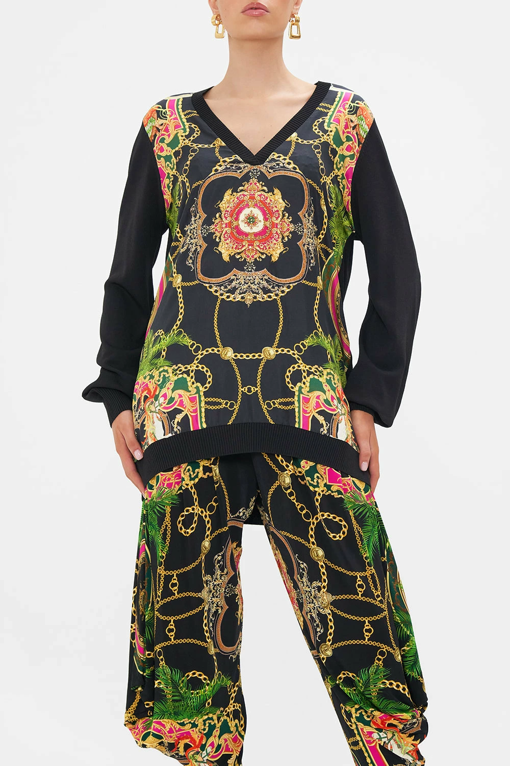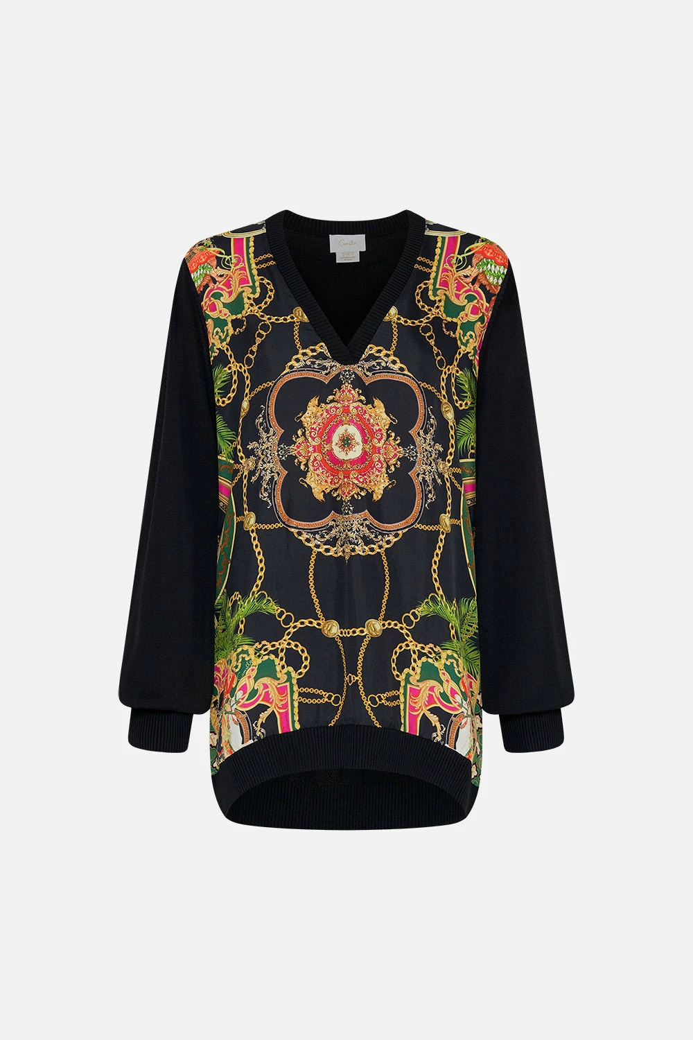 The Jealousy & Jewels V Neck Silk Front Jumper commands a rhapsody of elegantly curved formations framed with geometric mosaics. Gilded regal crests and equestrian motifs delicately intertwine with a net of gold chains and vibrant emerald green foliage. Crafted in a soft rayon nylon blended knit, this luxury jumper features a deep v neckline, silk printed front panel on the body, blouson sleeves and a wide cuff, finely finished with hem and neckline trim details. Lovingly handcrafted and designed in Australia, explore more from The Moral Of The Story: Act II collection.