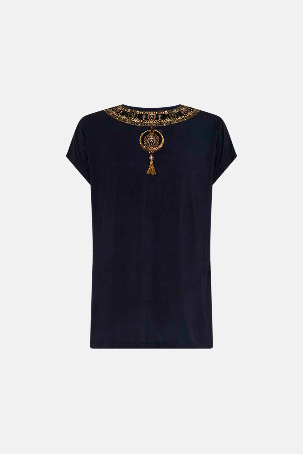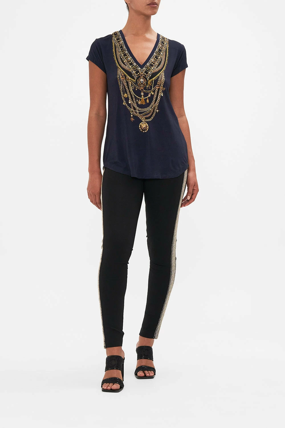 The Duomo Kaleido V Neck Tee celebrates the baroque details synonymous with the opulence of grand Italian duomos. Crafted with crystal embellishments, this luxury tee features a sleek v neckline, cropped sleeves, a relaxed loose-fit silhouette and a softly curved hemline. Pair with the Duomo Kaleido Straight Leg Track Pant for effortless casual chic. Lovingly handcrafted, designed in Australia. Explore more from the Amore Mio collection.