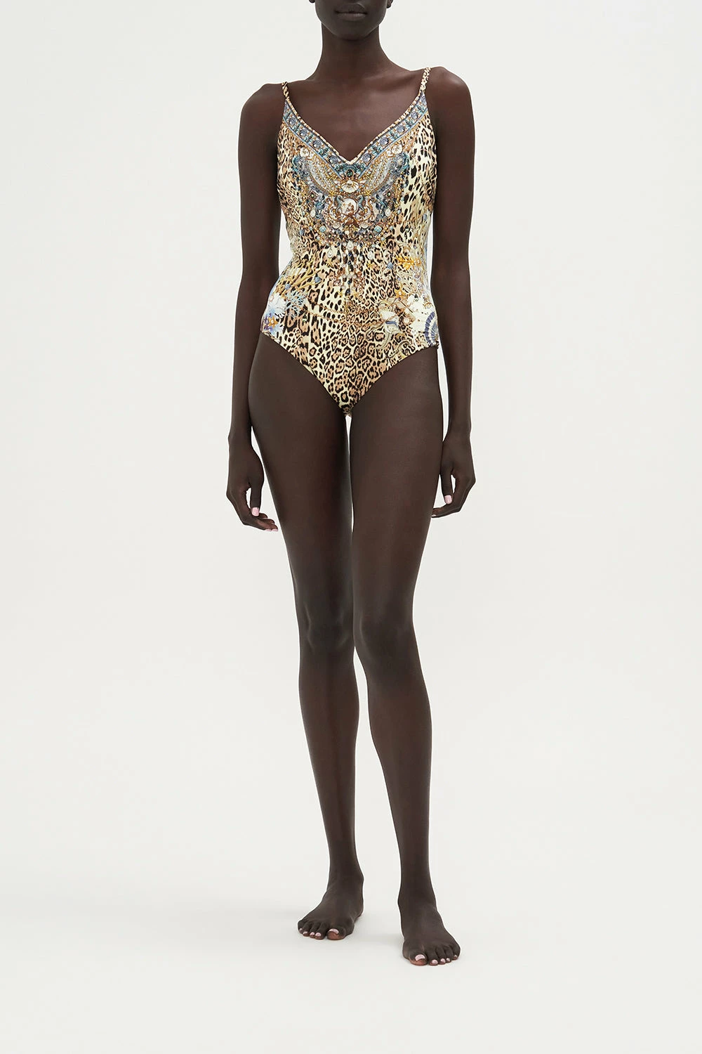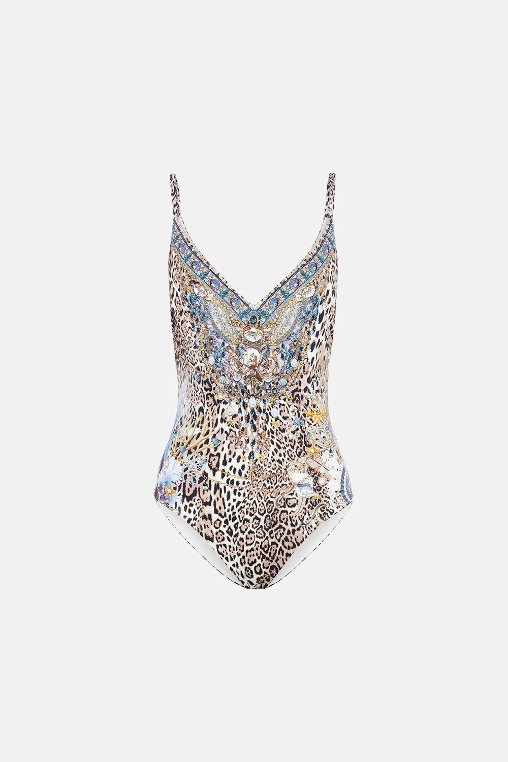 An eternal ode to the majesties of the seas, our Seahorse Sonnet V Neck Underwire One Piece captures our imagination with a sandy leopard print adorning soft shades of icy blue, coral reefs of decadent proportions and ornate golden intricacies. Crafted from ECONYL® regenerated nylon, this sustainable one piece features a deep v neckline with underwire support, a mid-rise silhouette to subtly elongate the leg and hand-embellished CAMILLA crystals. Style it by the sea or pair back with denim for everyday wear.