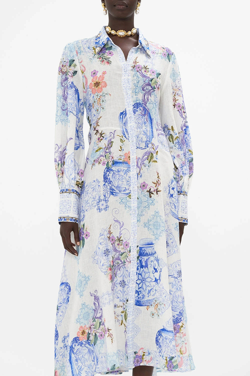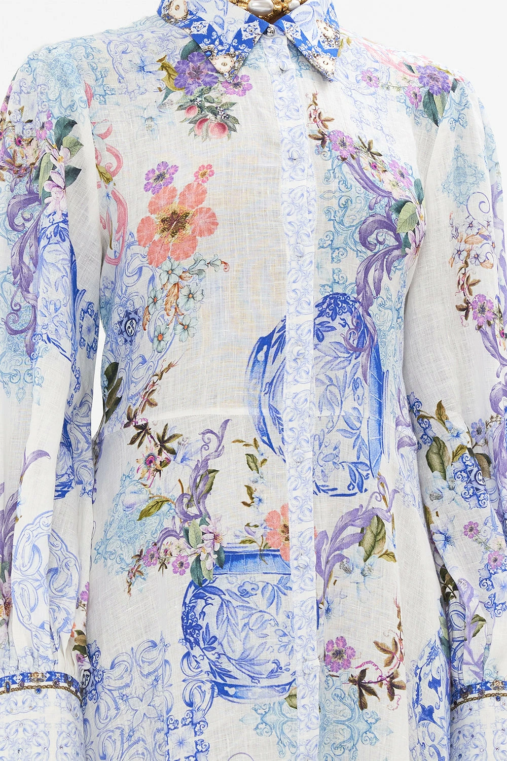 The Paint Me Positano Waist Tie Shirt Dress explores the magical pathways of intricate Italian tile mosaics entwined with delicate pastel florals. This striking full length luxury CAMILLA linen shirt dress features a waist tie detail which can be worn at the front or back, button through enclosure and shirred detail on waist. Lovingly handcrafted, designed in Australia. explore more from the Amore Mio collection.