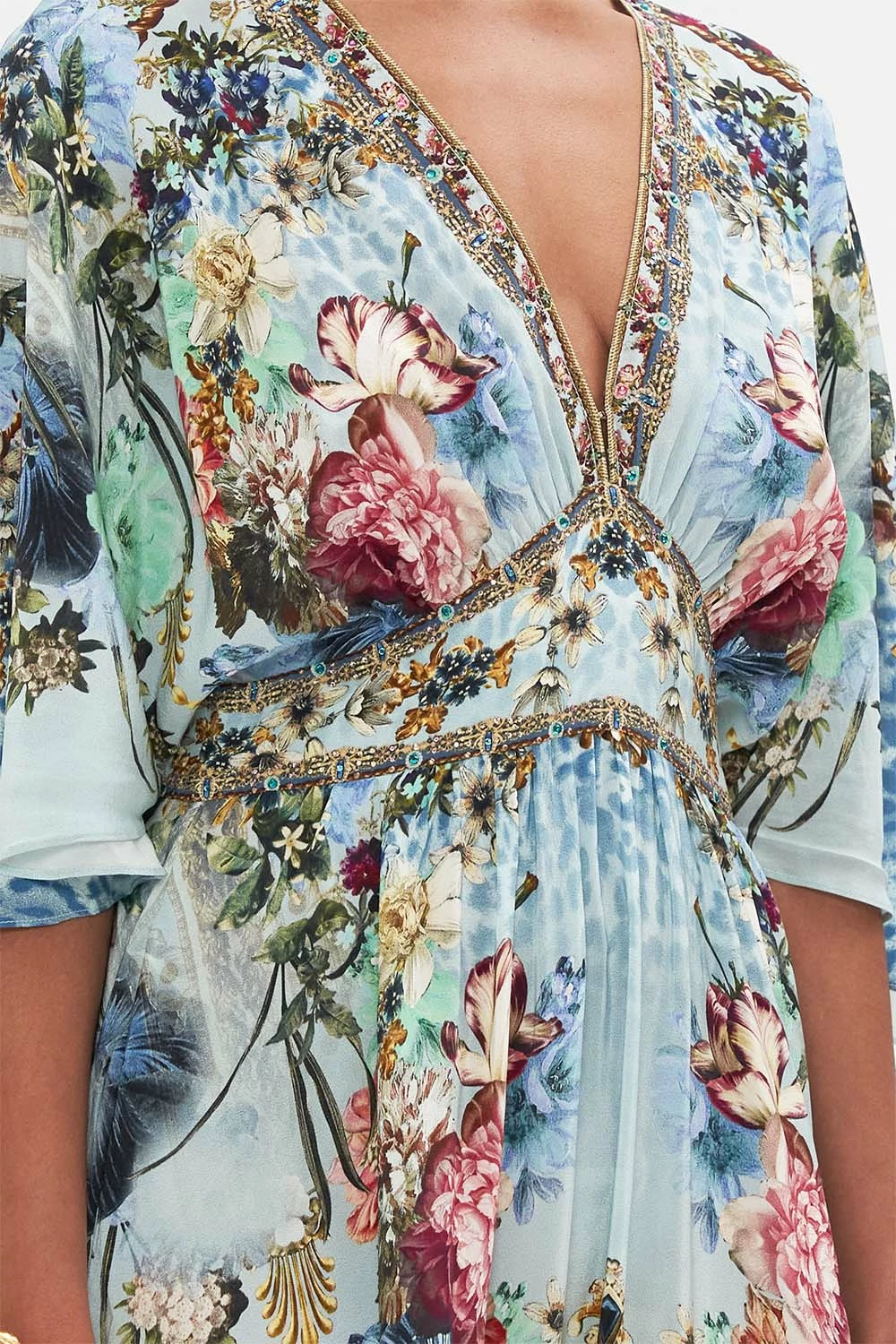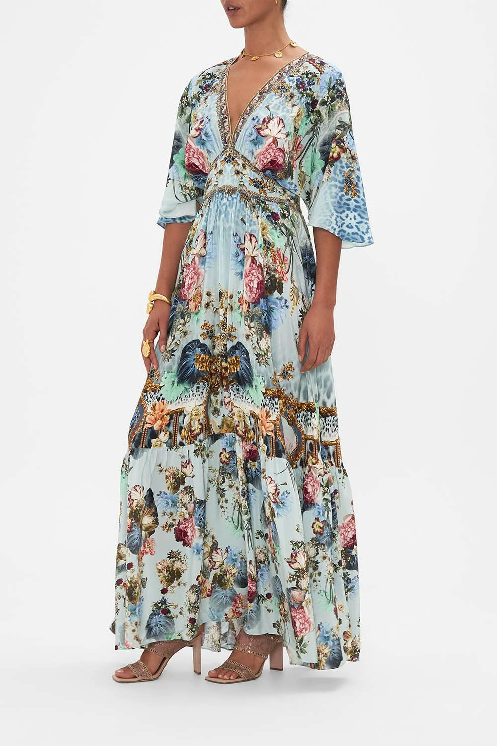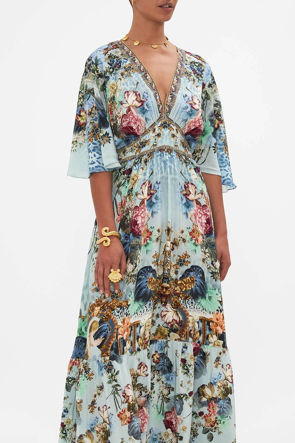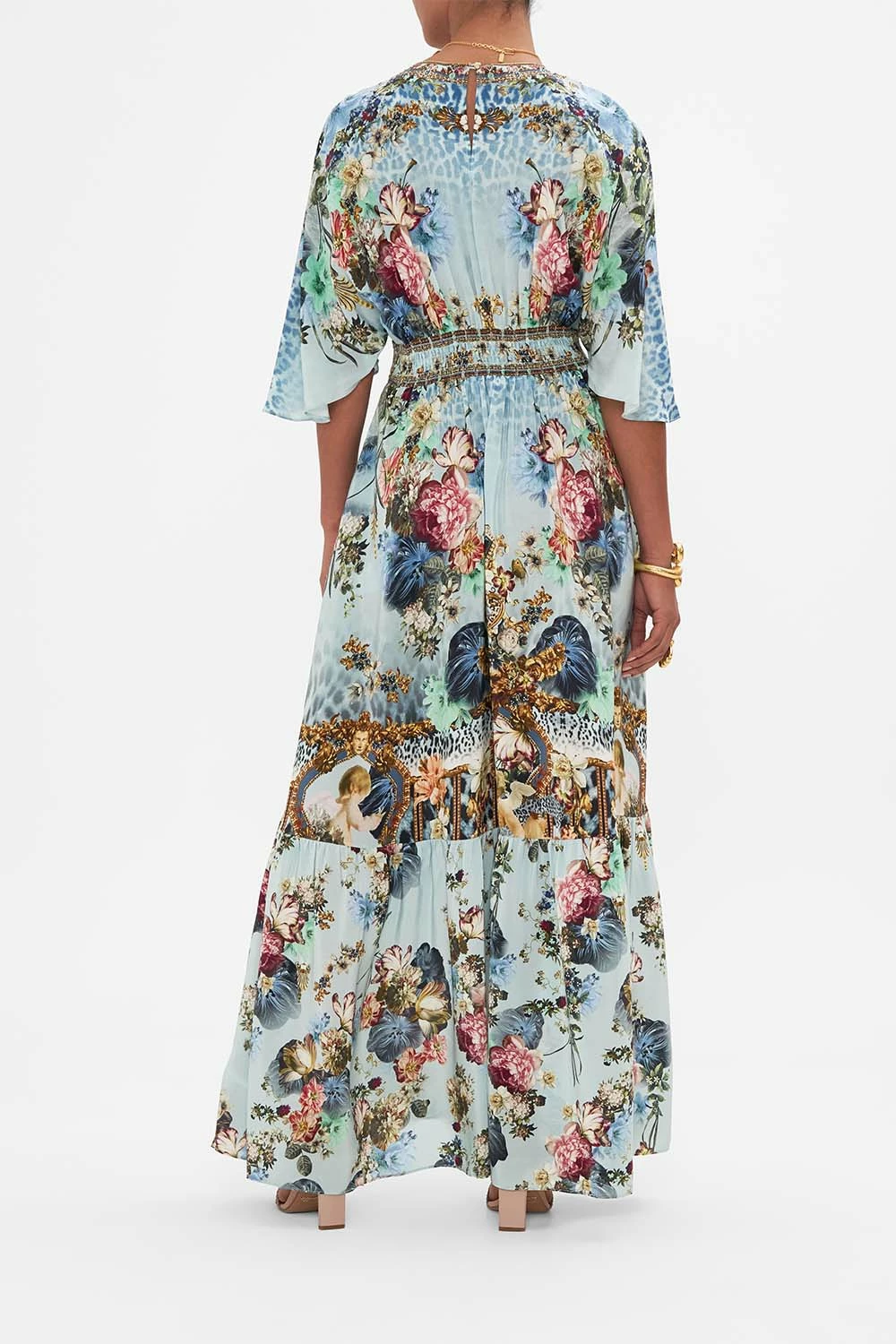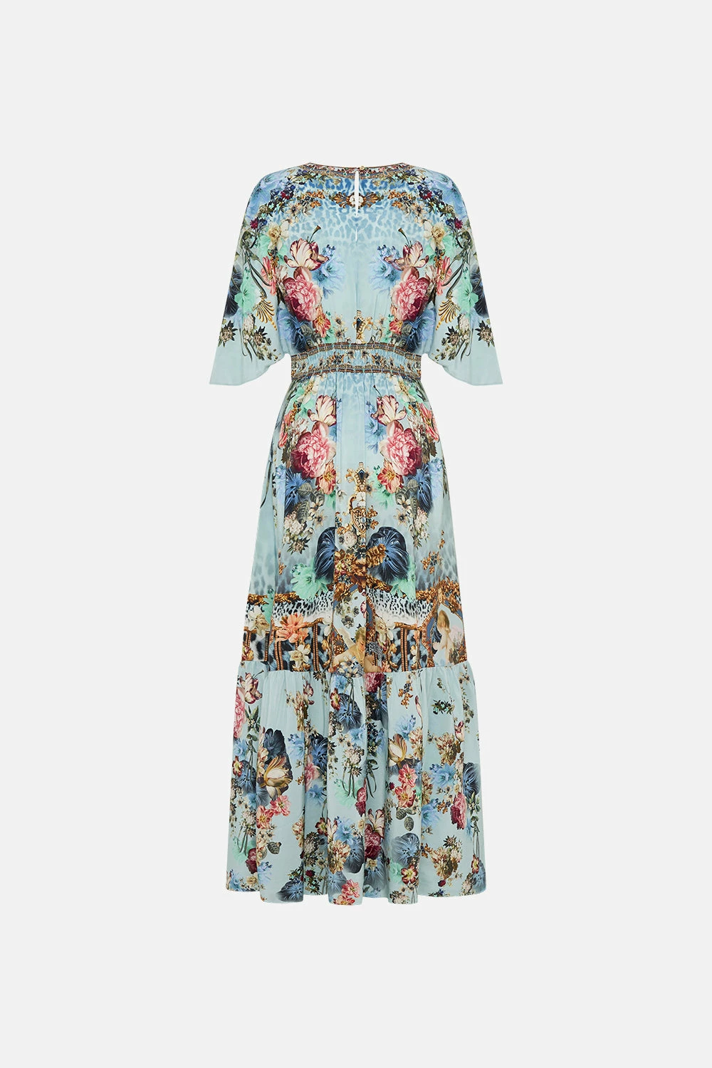 The Letters To Leo Waisted Dress With Hem Ruffle echoes the sweet symphony fresco blues awashed in opulent florals, ethereal cherubs and grand gilded archways. A beautifully feminine silhouette, this luxury silk maxi dress features signature crystal embellishments, a shaped waistband with back shirring details to cinch and accentuate the curves, floaty draped statement sleeves, pocket functionality and a wide ruffle on the full length hemline. Designed to move you stylishly from places, parties and magical moments. Lovingly handcrafted, designed in Australia. Explore more from the Amore Mio collection.
