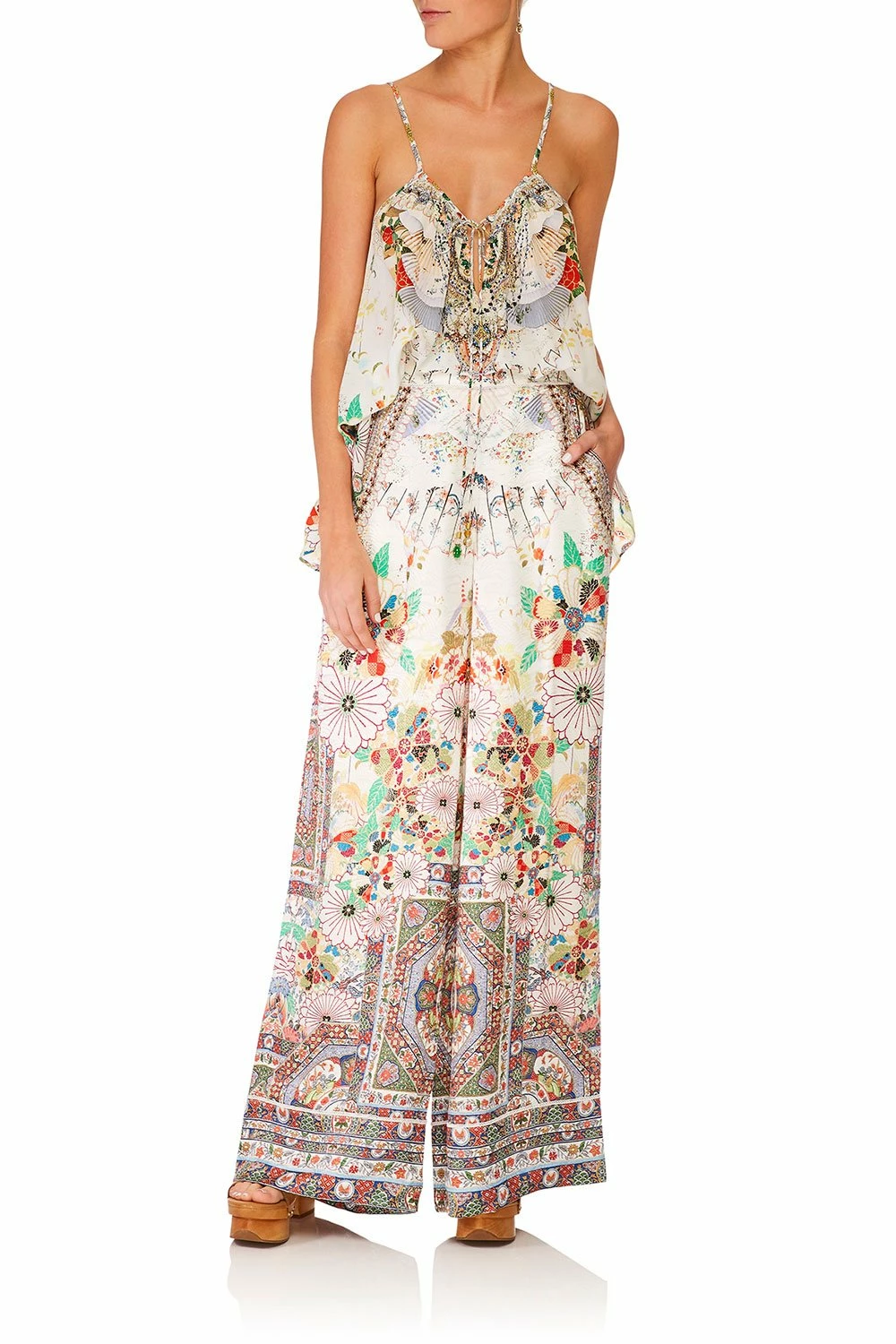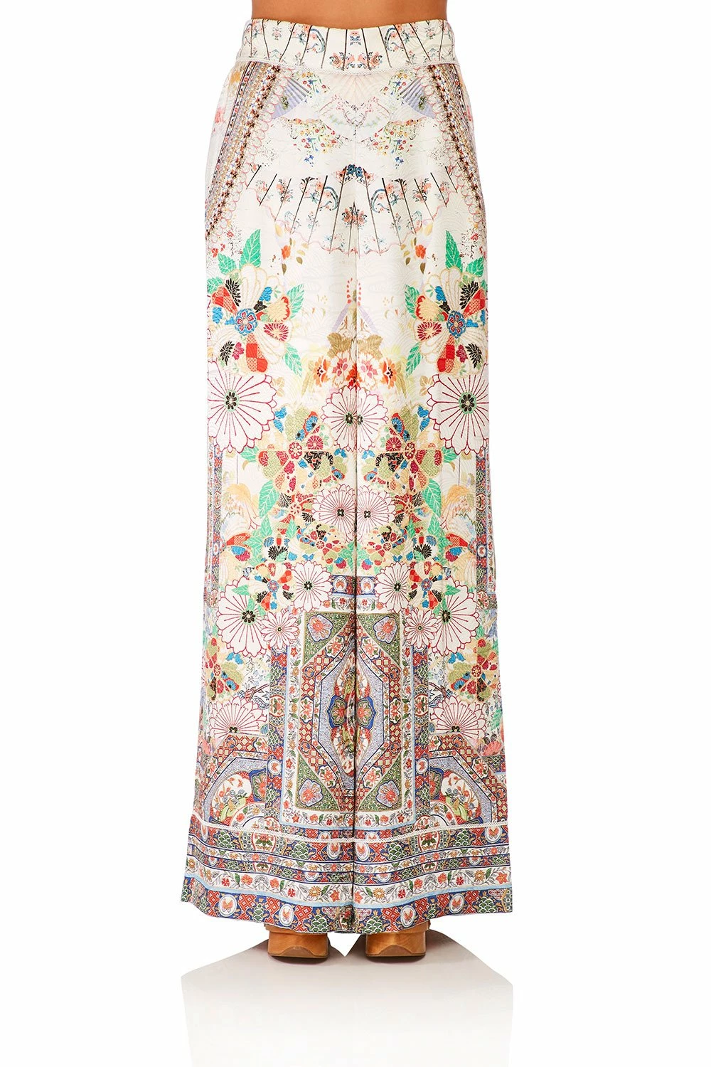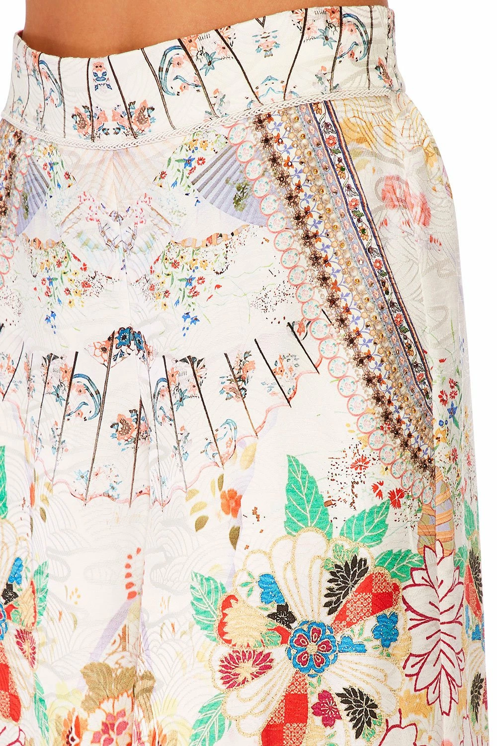 An ode to the timeless gems of her enchanting wardrobe, the Time After Time Wide Leg Pant with Cuffs evokes Japan’s graceful gardens and traditional silk fans with a heavenly hand-painted print. Made from a sensuous silk blend, these graceful relaxed-fit trousers feature embellished cutaway pockets, contrast print cuffs and a dreamy wide leg silhouette sure to entrance.