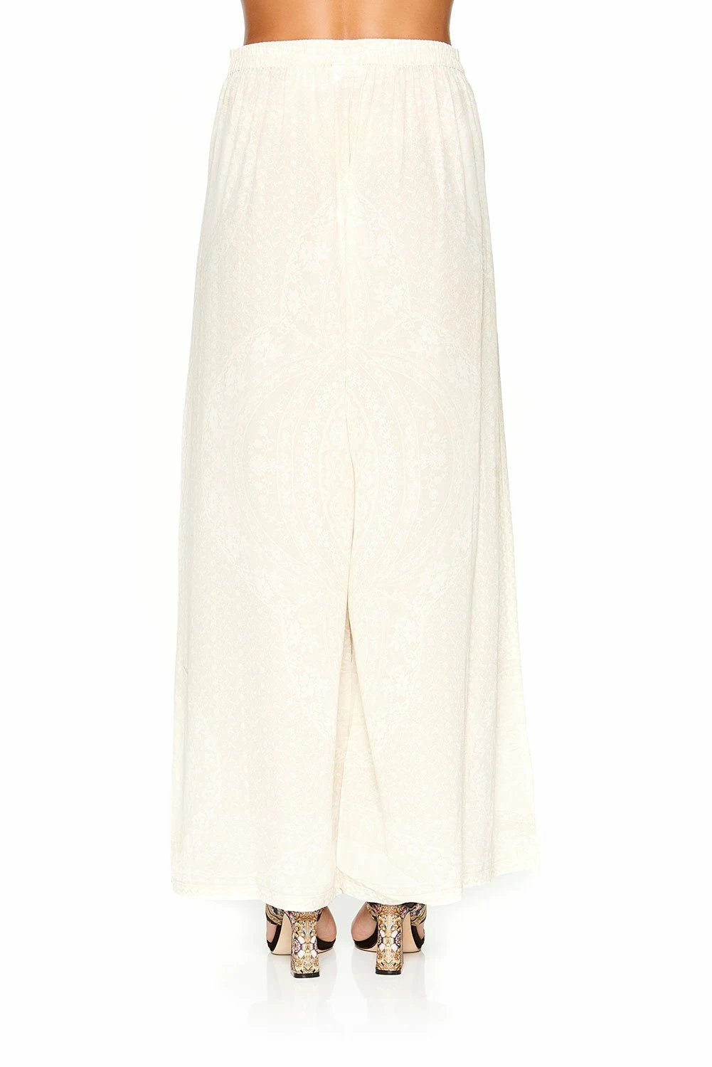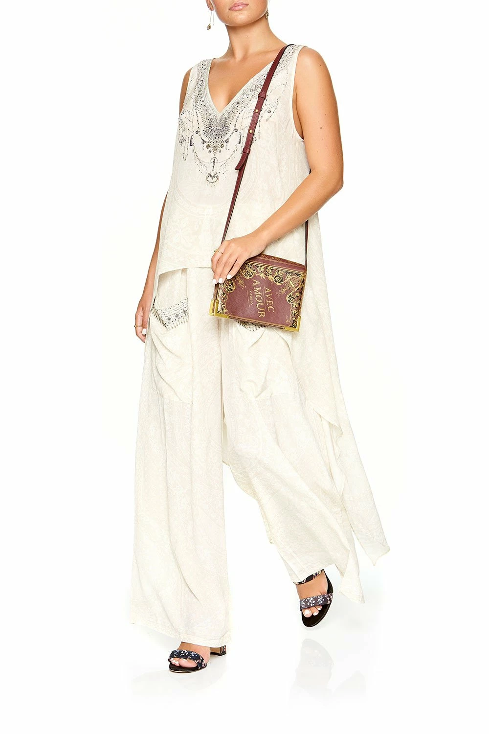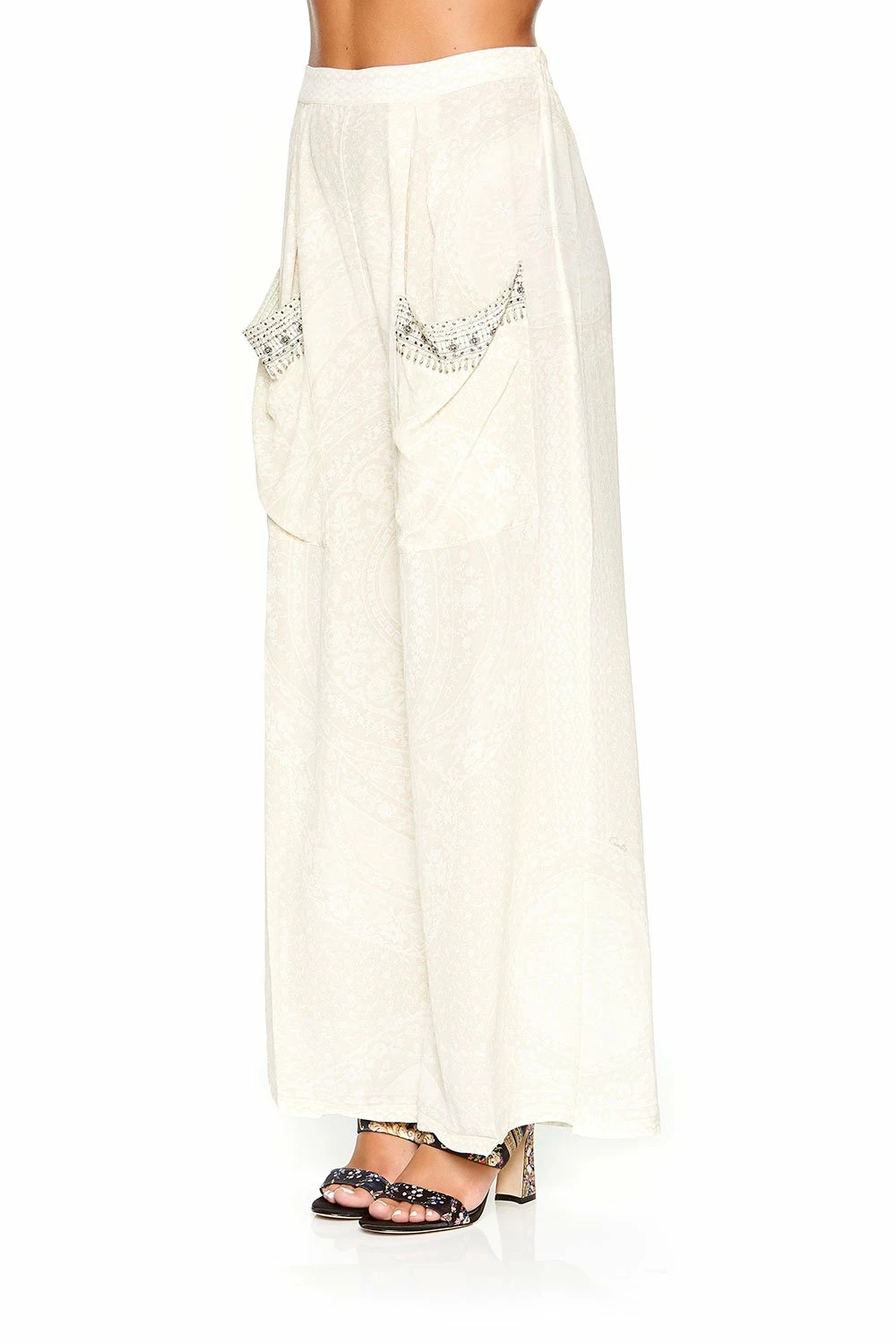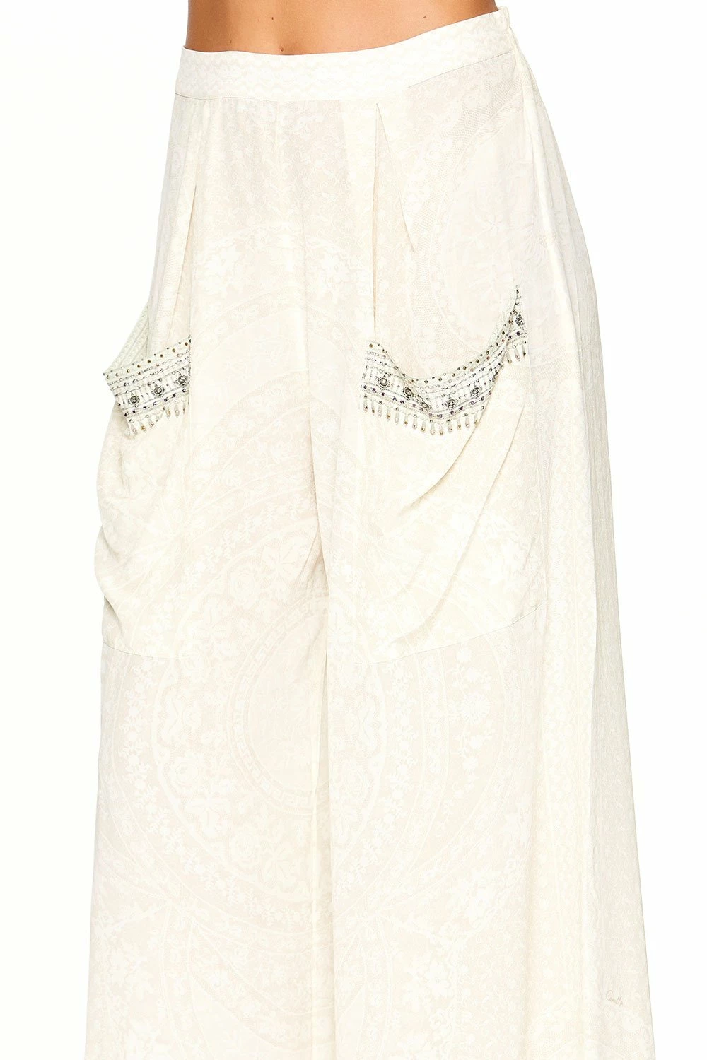 With echoes of the sumptuous palaces of Versailles, the Dentelle Blanche Wide Leg Trouser with Front Pockets is unashamedly decadent. Featuring creamy silk, elastic back waist, as well as patch pockets with crystal embellishment – these bejeweled pants are ideal for dusk till dawn soirees.