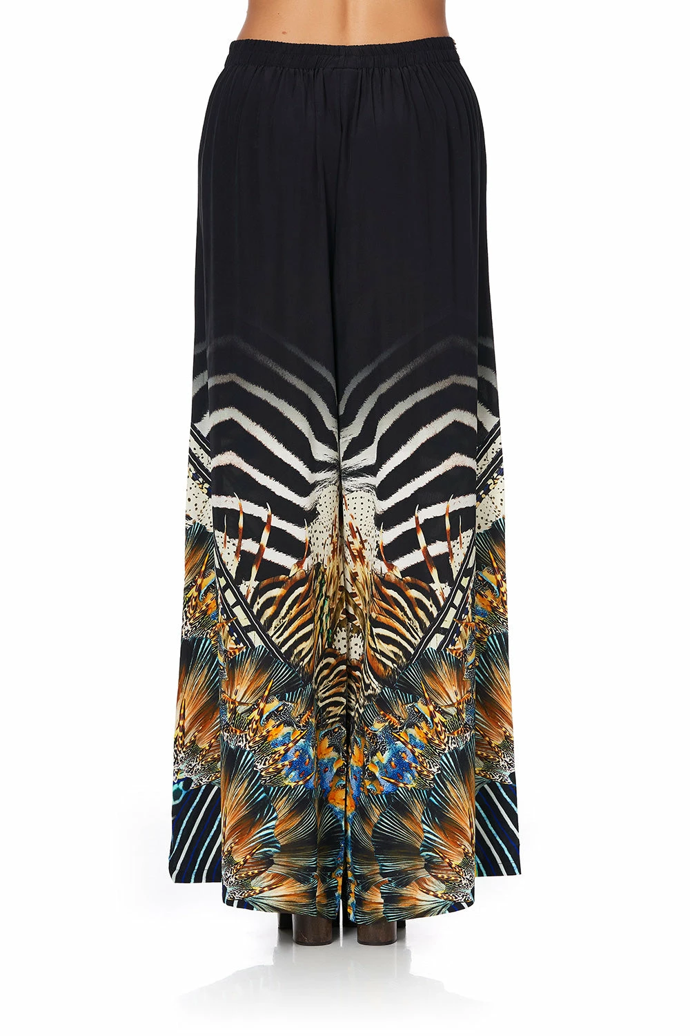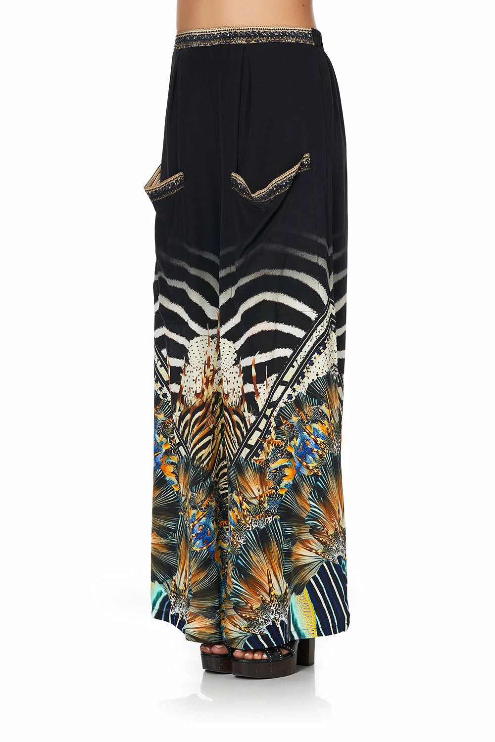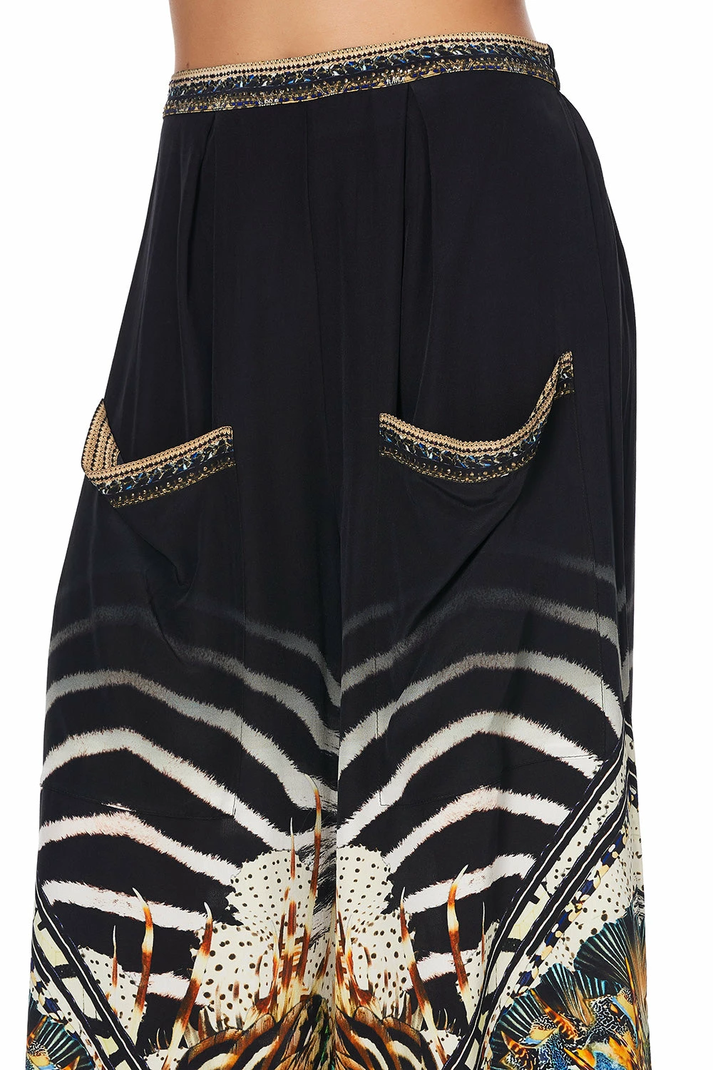 Accents of large feature side pockets and shirred elastic waistband provide luxurious silky comfort whilst hand placed crystal embellishments add the statement CAMILLA touch to this effortless high waisted silhouette.