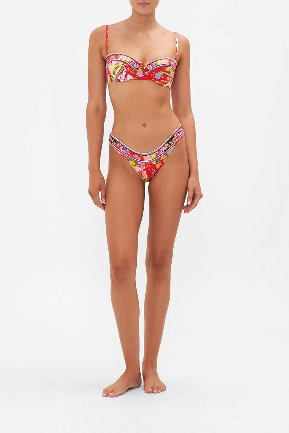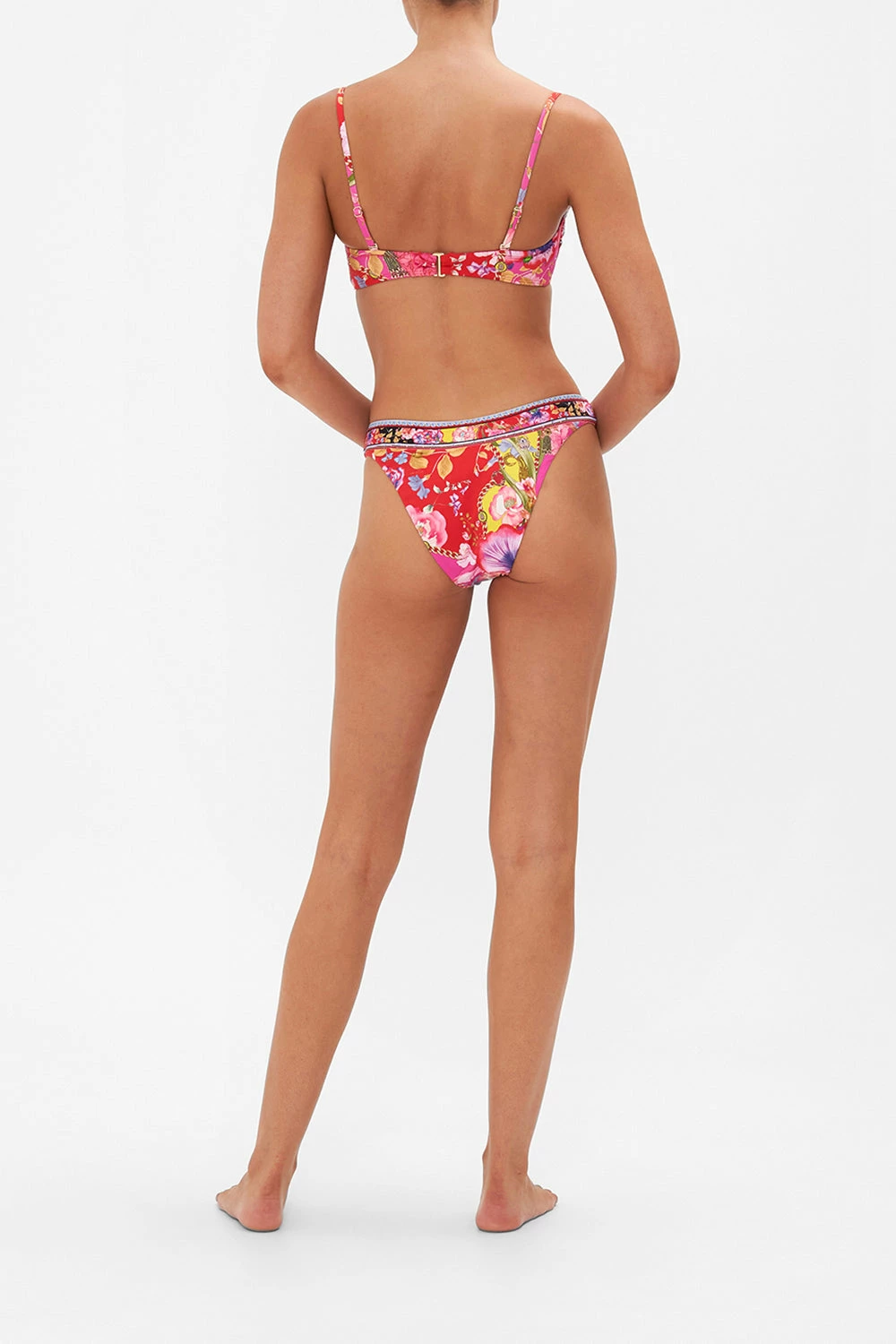 The Beetles Wide Side High Leg Pant captivates our gaze with a scarlet red and magenta symphony defined by kaleidoscopic poppies, cascades of irises that float amidst beautiful beetle-backs and frilly carnations that tantalise in soft-spoken pinks. Crafted from ECONYL® regenerated nylon, this sustainable bikini bottom is home to a contrasting wide waistband, a high-rise silhouette that elongates the legs, hand-embellished CAMILLA crystals and regular bottom coverage.