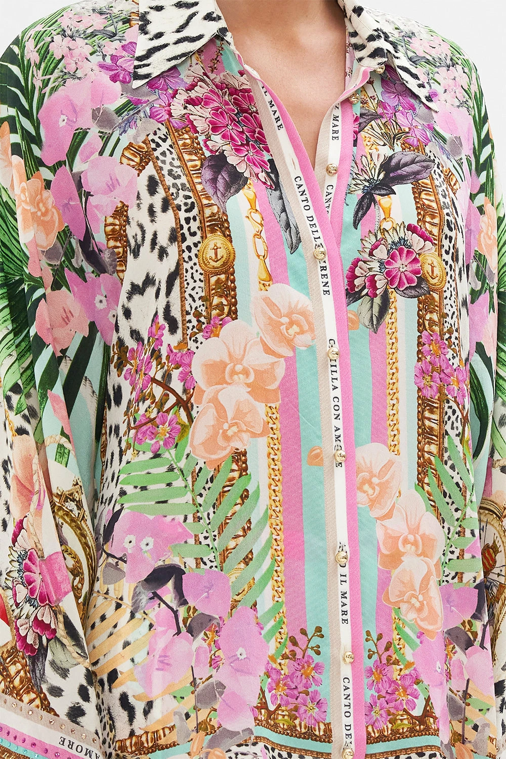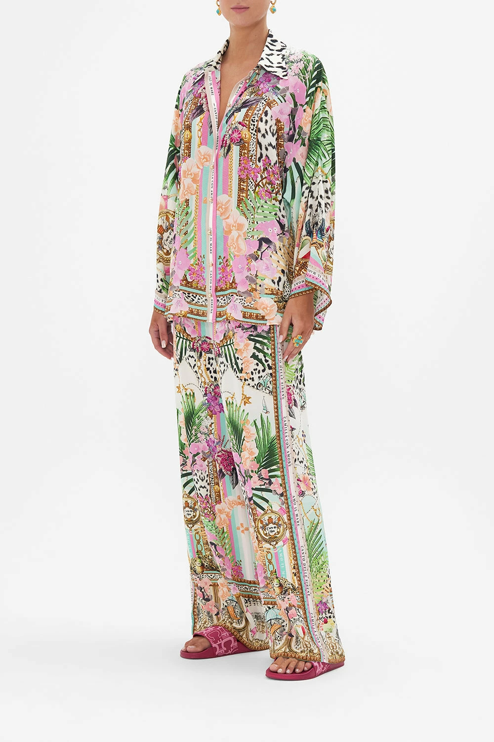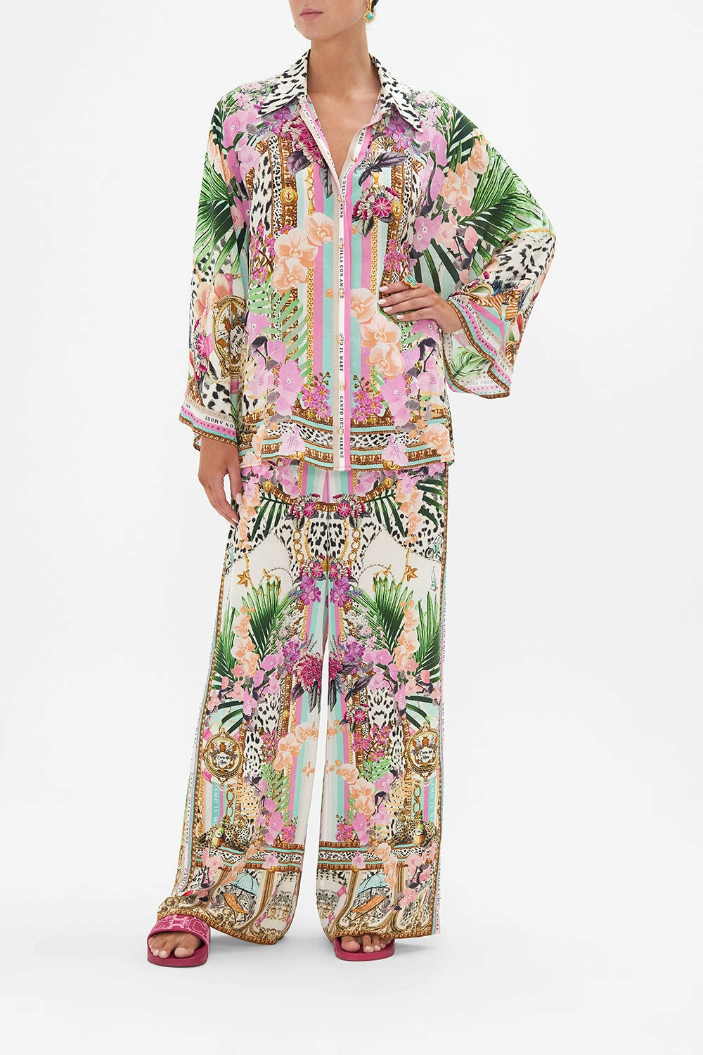 The Dear Amore Mio Wide Sleeve Blouse depicts a world of lush foliage and feline motifs dancing amongst golden archways. Adorning CAMILLA crystals, this luxury silk shirt features a statement kimono sleeve, button down placket enclosure, a soft tailored collar and a relaxed silhouette. Wear with the Dear Amore Mio Minimal Wide Leg Pant as a luxe printed matching set. Lovingly handcrafted, designed in Australia. Explore more from the Amore Mio collection.
