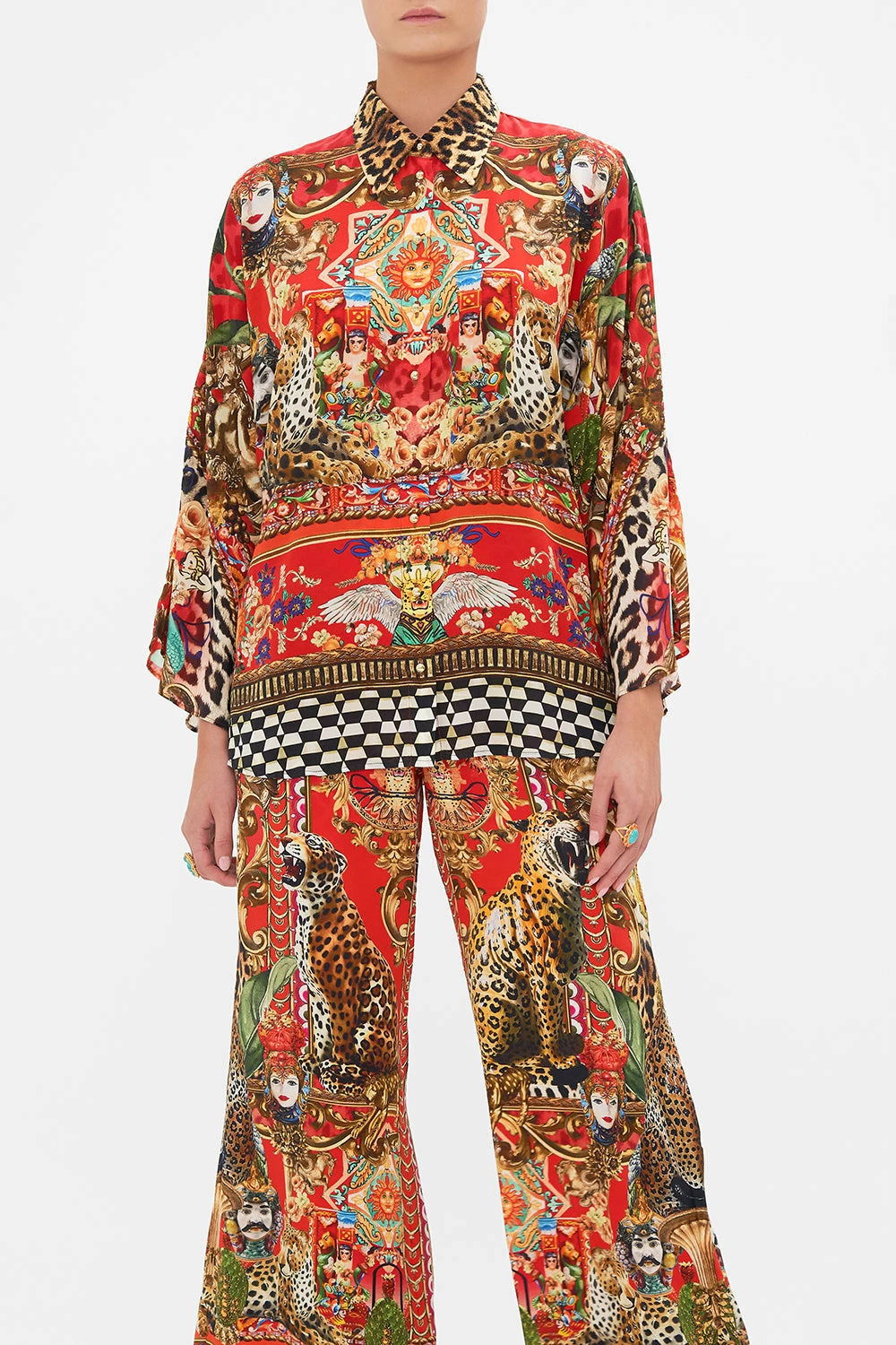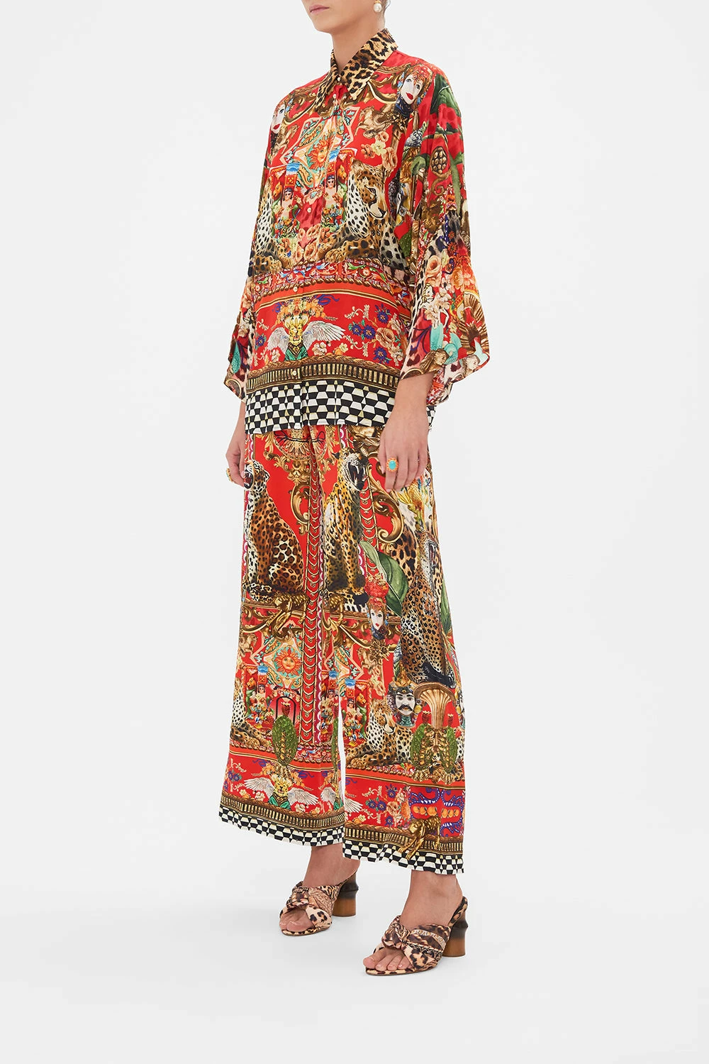 The From Generation To Generation Wide Sleeve Blouse depicts archways into a world of wilderness and ancient symbols set amongst rich ruby reds. Adorning CAMILLA crystals, this luxury silk shirt features a statement kimono sleeve, button down placket enclosure, a soft tailored collar and a relaxed silhouette. Pair with the From Generation To Generation Minimal Wide Leg Pant for chic co-ord styling. Lovingly handcrafted, designed in Australia. Explore more from the Amore Mio collection.