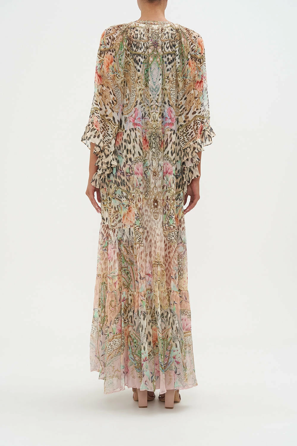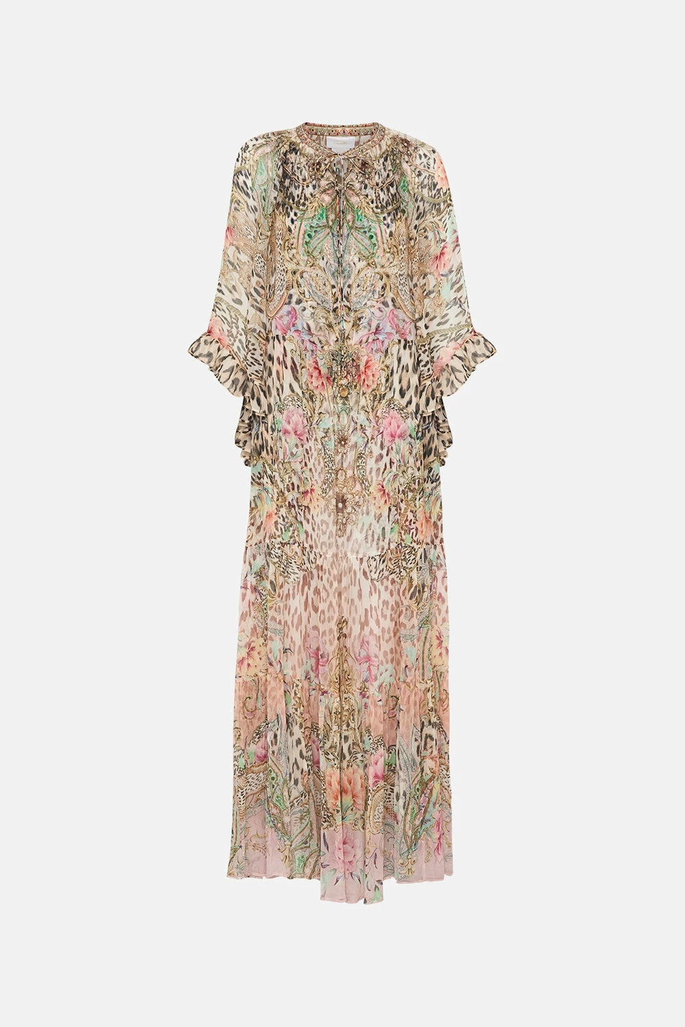 The Queen Atlantis Wide Sleeve Gathered Dress brings back a classic with timeless leopard print finished with petals dipped in blush hues, roped accents and gold baroque detailing. Crafted from signature CAMILLA silk, this luxury dress features hand-embellished crystals, a wide statement sleeve, tassel neck ties that draped from the décolletage and a relaxed silhouette that cascades into a tiered maxi skirt.