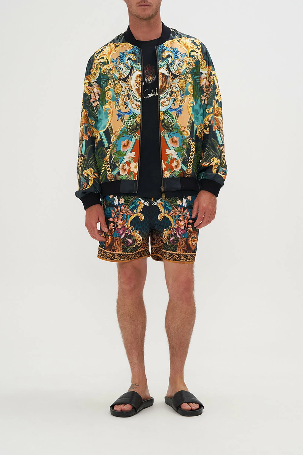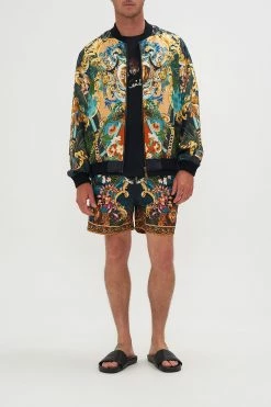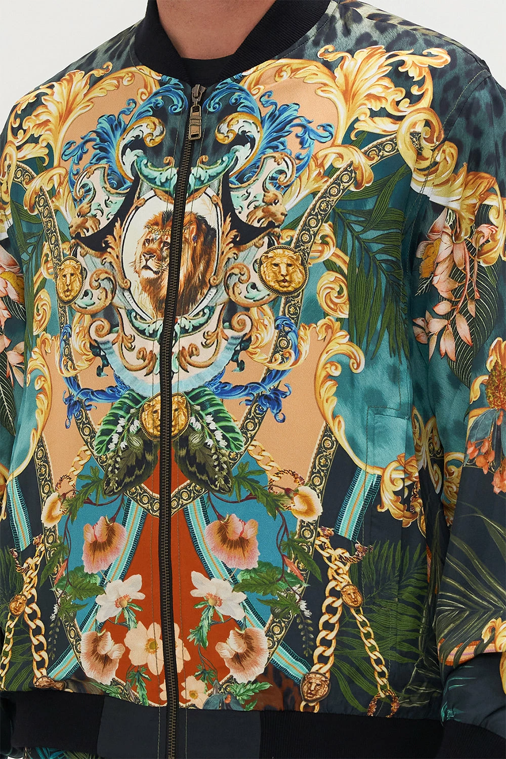 The Fearless Felis Zip Through Bomber Jacket is wrapped in a sea of rich midnight hues enveloped by gold baroque details, cascades of forest ferns and soft botanicals dipped in honey hues that bloom from emerald vines. Crafted for effortless transeasonality, this luxury bomber jacket sports an elasticated contrast cuff and hem, zip fastening, pocket functionality and a casually relaxed silhouette.