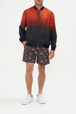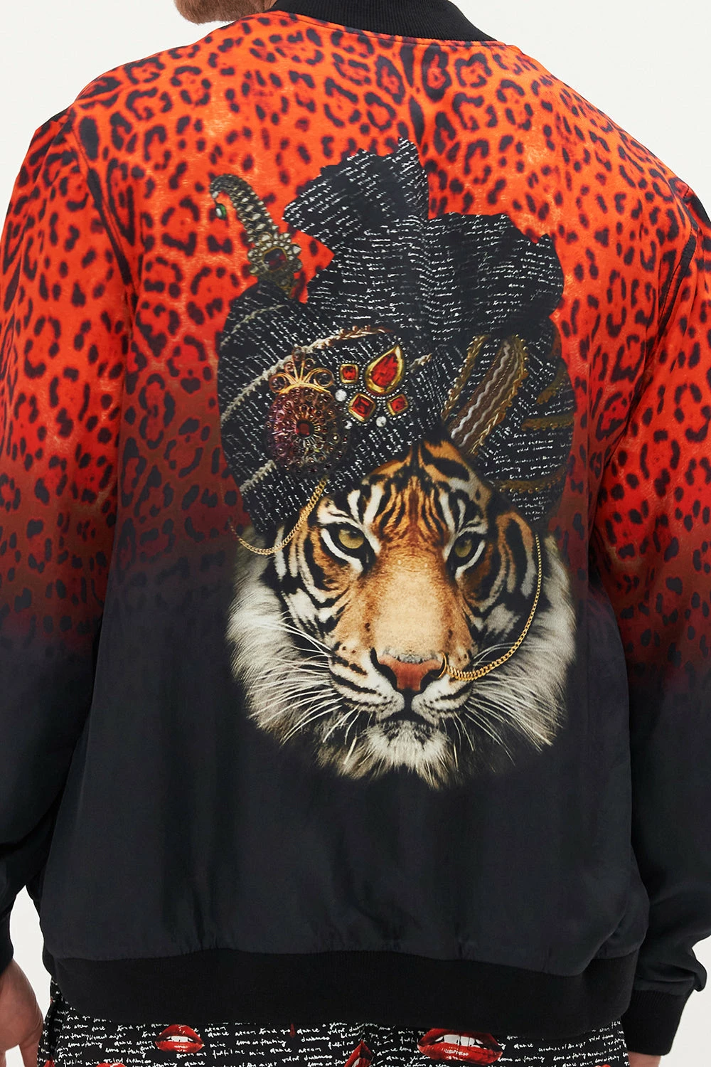 The Chaos Magic Zip Through Reversible Bomber is a bold and visual icon of a regal tiger immersed in a scene of fiery red animal print fading into a soft ombre black. For a change in accent, turn your bomber inside-out for a swirl of midnight hues. Crafted from a soft silk blend, this luxury bomber jacket features a multi-wear design, elasticated contrast cuffs and hem, zip fastening, pocket functionality and a casually relaxed silhouette. Lovingly handcrafted, designed in Australia, explore more from The Moral Of The Story: Act II collection.